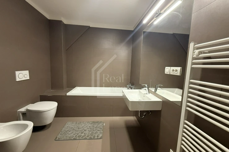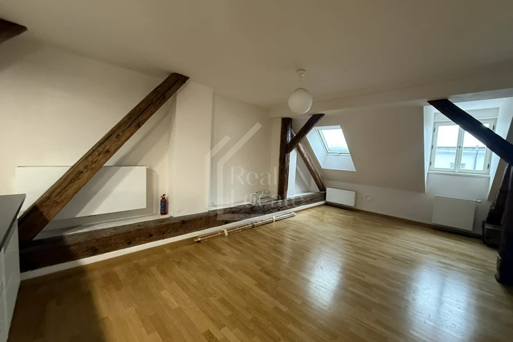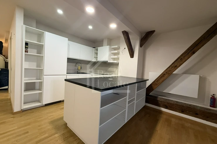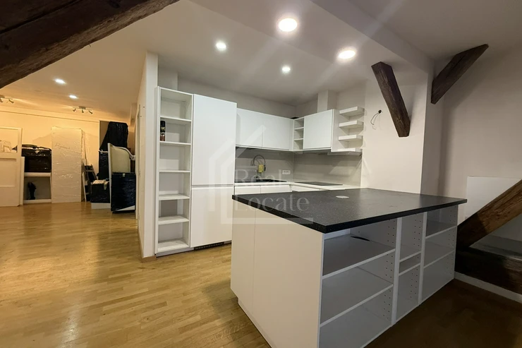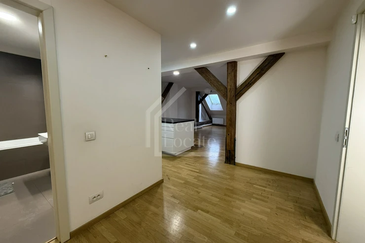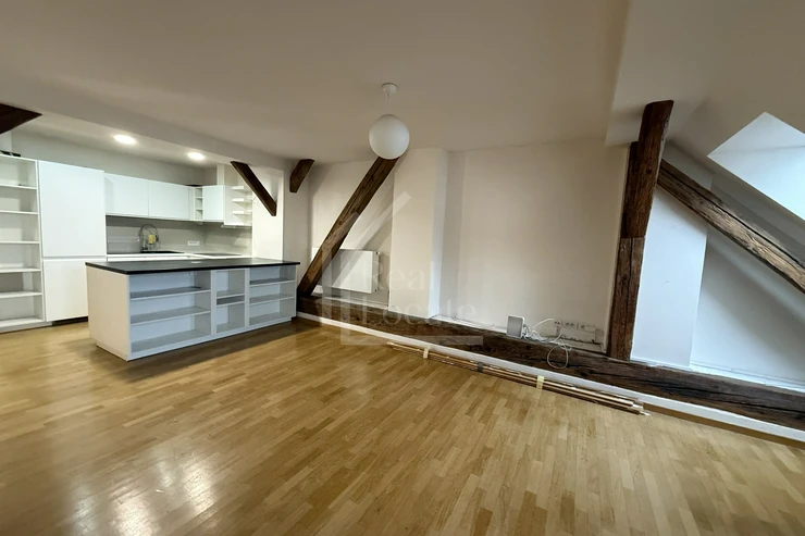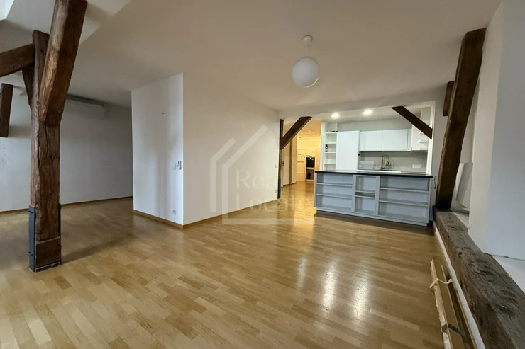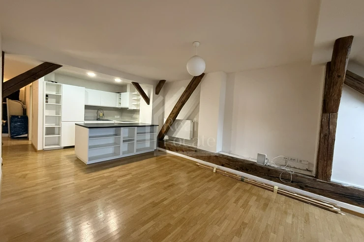 This is an attic apartment with a total area of 89 sqm, offering plenty of natural daylight. The apartment features a fully equipped modern kitchen with all appliances, including a cooker hood, cooktop, electric oven, dishwasher, and fridge with freezer. The interior has an elegant yet rustic touch, highlighted by exposed wooden beams.