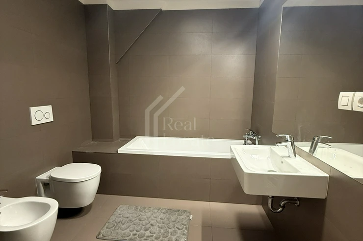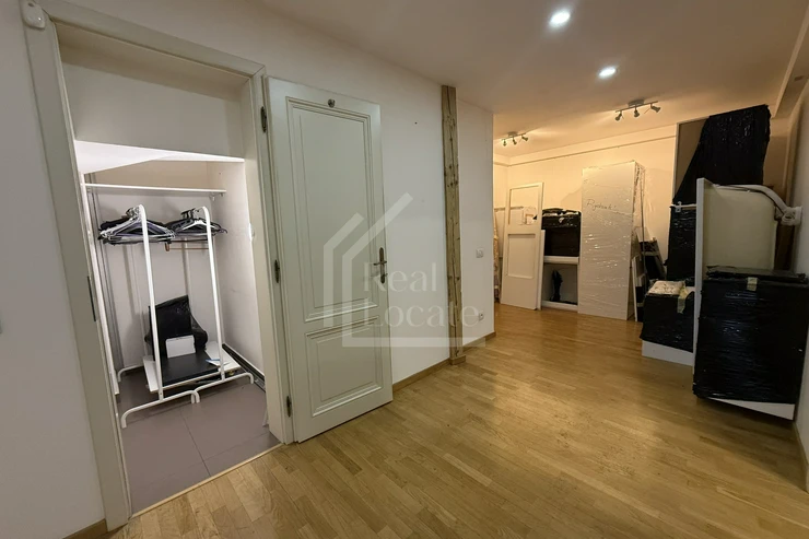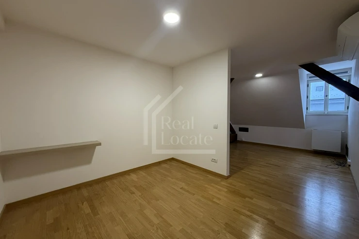 The apartment is very spacious and cleverly divided into different sections. The bedroom is not separated by doors from the living area. There is a large kitchen connected to the living room and a bathroom with a bathtub. The apartment is offered unfurnished.