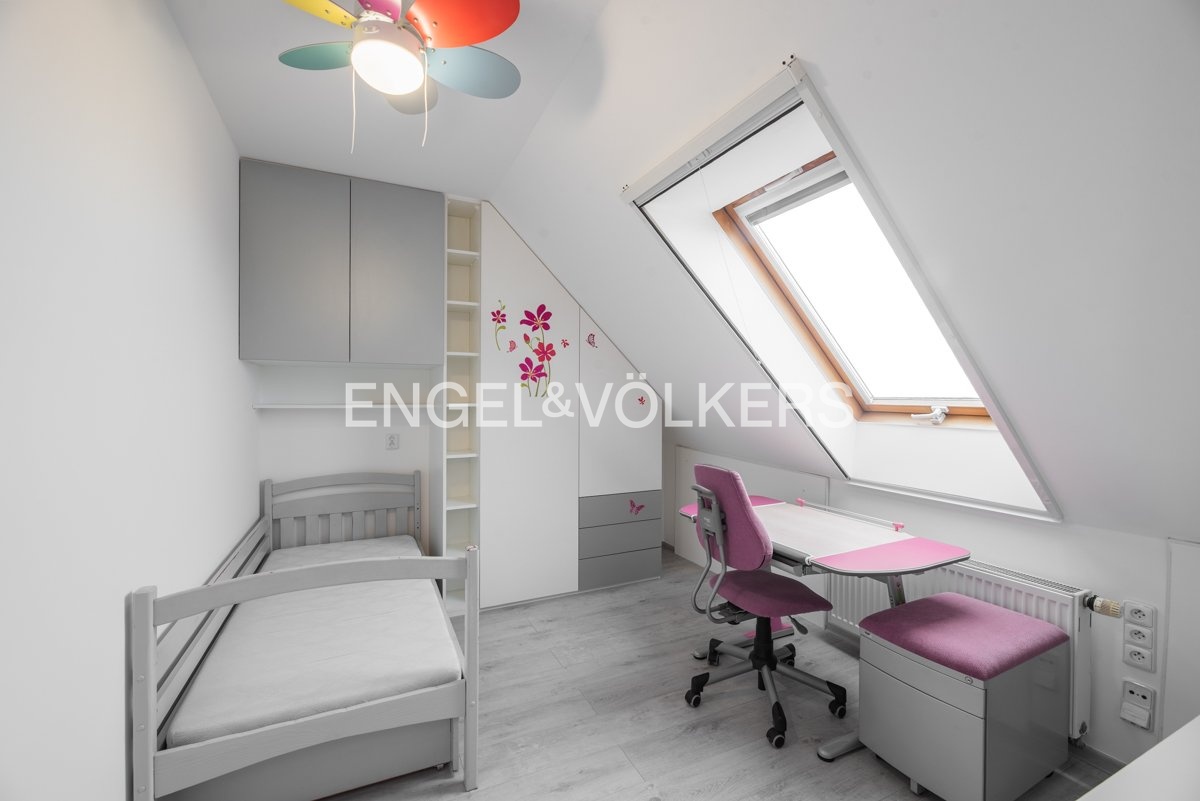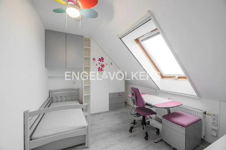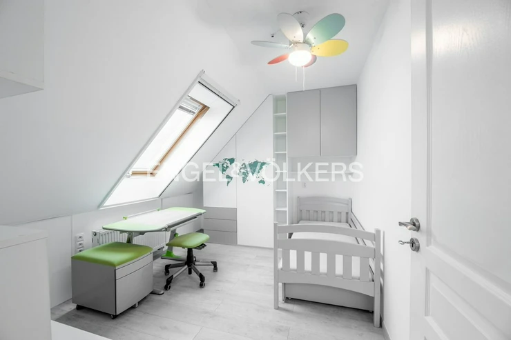 Stairs lead to the upper floor, where there is a master bedroom with built-in storage space, two children's rooms with custom-made furniture, and a spacious bathroom equipped with a bathtub, shower, and toilet. A huge advantage is the spacious sunny terrace facing the courtyard of the building. The apartment is rented fully furnished and is ready for immediate occupancy. The rent includes internet and television.