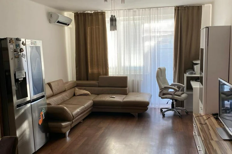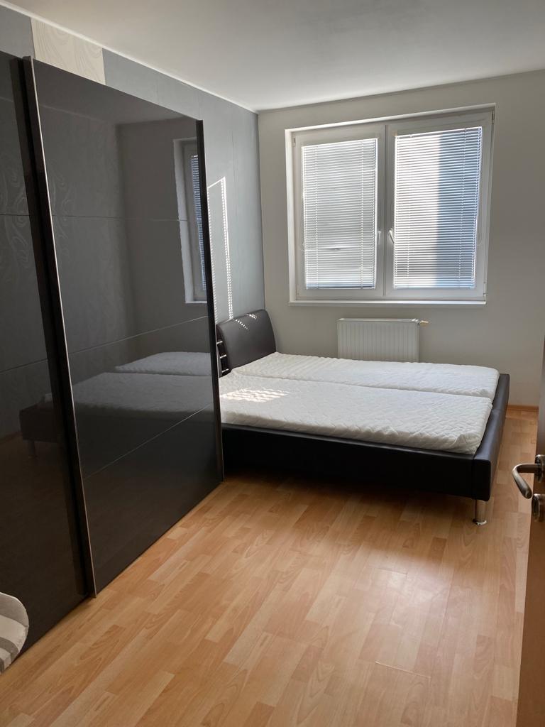 The apartment is fully furnished with furniture and appliances and provides comfortable living in a popular area of Prague with good access to the city center. The layout includes a living room with a kitchen area, two separate bedrooms, a bathroom, a toilet, and an entrance hall.