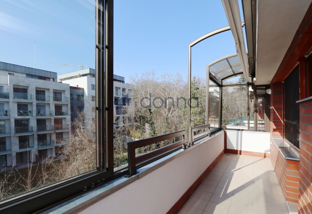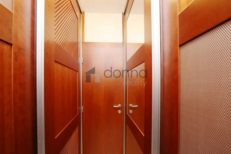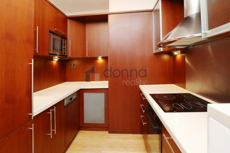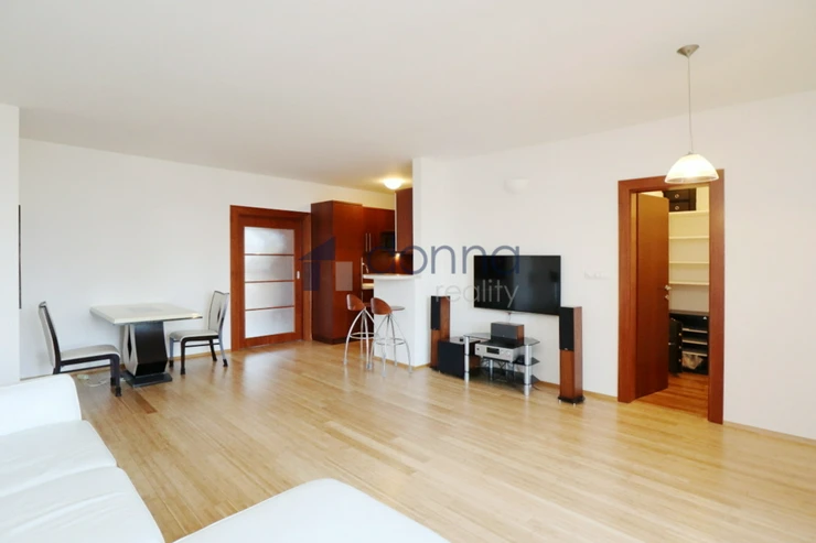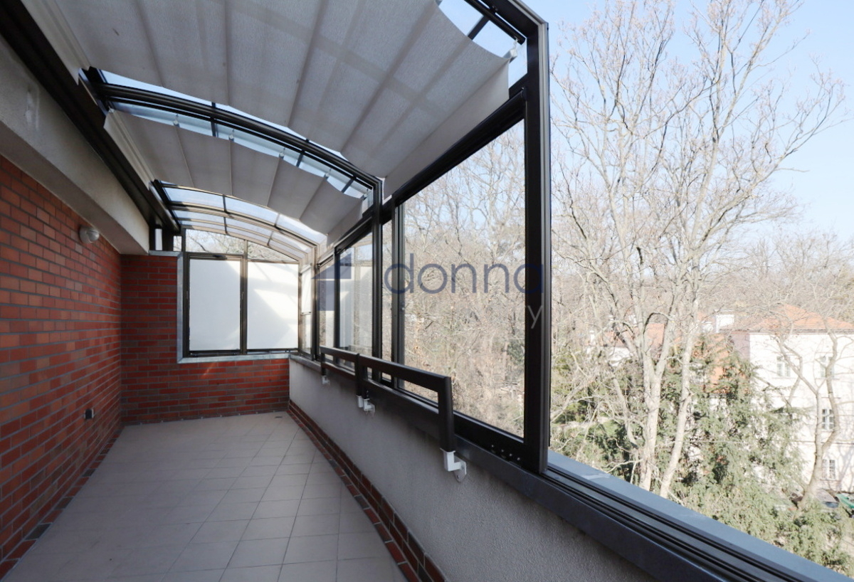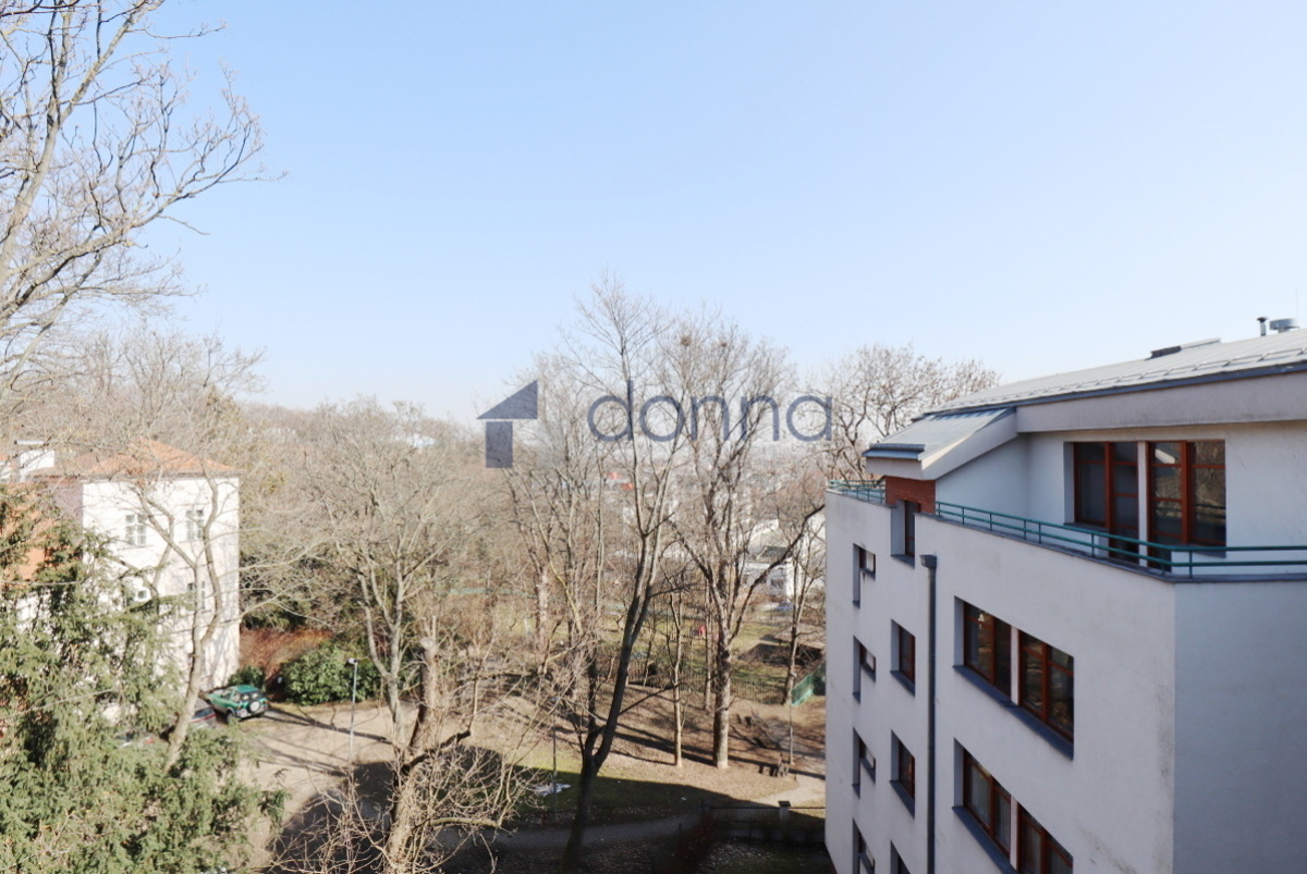 Apartment for rent a 2+kt/2xT apartment, 82sqm, on the top floor of a residential building with a 24/7 reception desk and a shared garden for the residents of the building, in U Nikolajky street, Prague 5 - Smíchov. The apartment is fully furnished and consists of an entrance hall, a dressing room, a large bedroom with access to one terrace, a bathroom with a corner bath and shower, a spacious living room with a kitchenette and a storage room with a safe. The toilet is separate. The living room leads to the second terrace. Both terraces have an opening roof. The kitchen has a fridge with freezer, dishwasher, microwave, electric hob and extractor hood. There is a washing machine in the bathroom. Heating and water heating are central. The floors are wooden parquets and tiles. There are external blinds on the windows. It is also possible to rent a garage space with the apartment. The house is located in a quiet part of Smíchov.