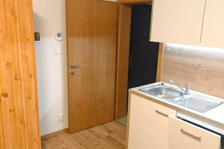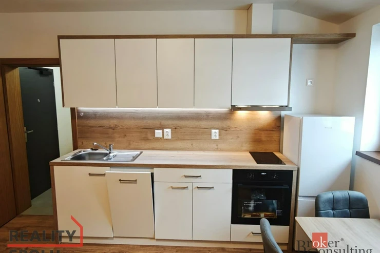 Dispozice 1+kk nabízí prakticky řešený obytný prostor s kuchyňským koutem, moderní koupelnu a dostatek úložného prostoru. Interiér je světlý a vybaven kvalitními materiály.