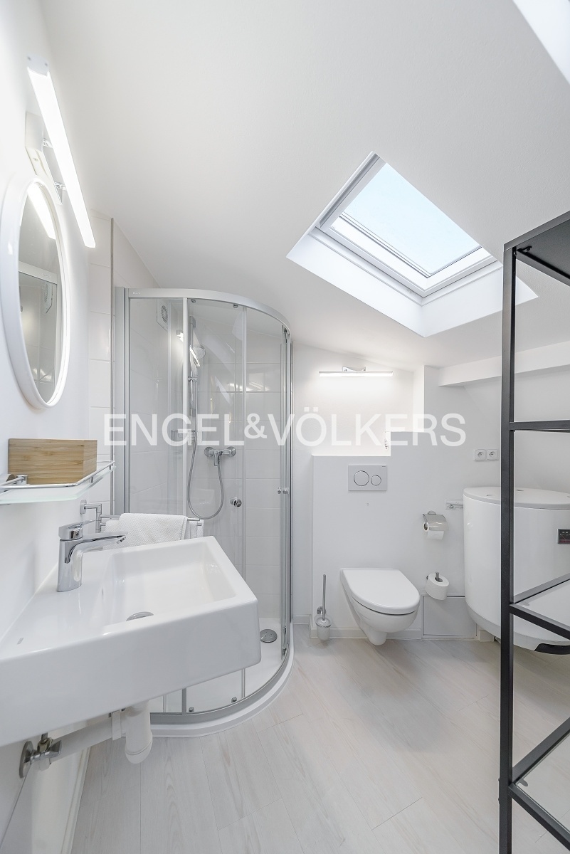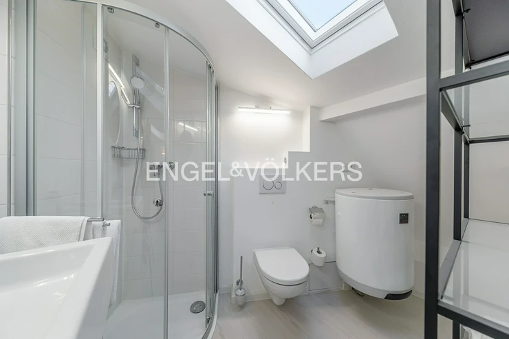 Bathroom area with shower. Air conditioning is installed in the apartment for the comfort of the tenant, and is used for cooling and heating. Water heating is provided by an electric boiler.