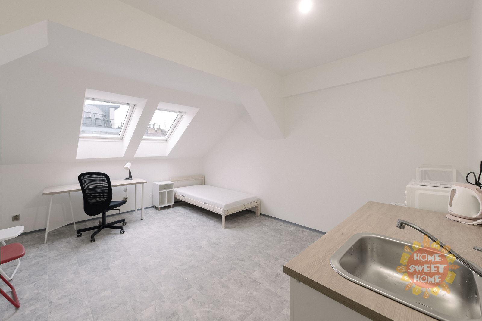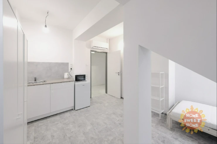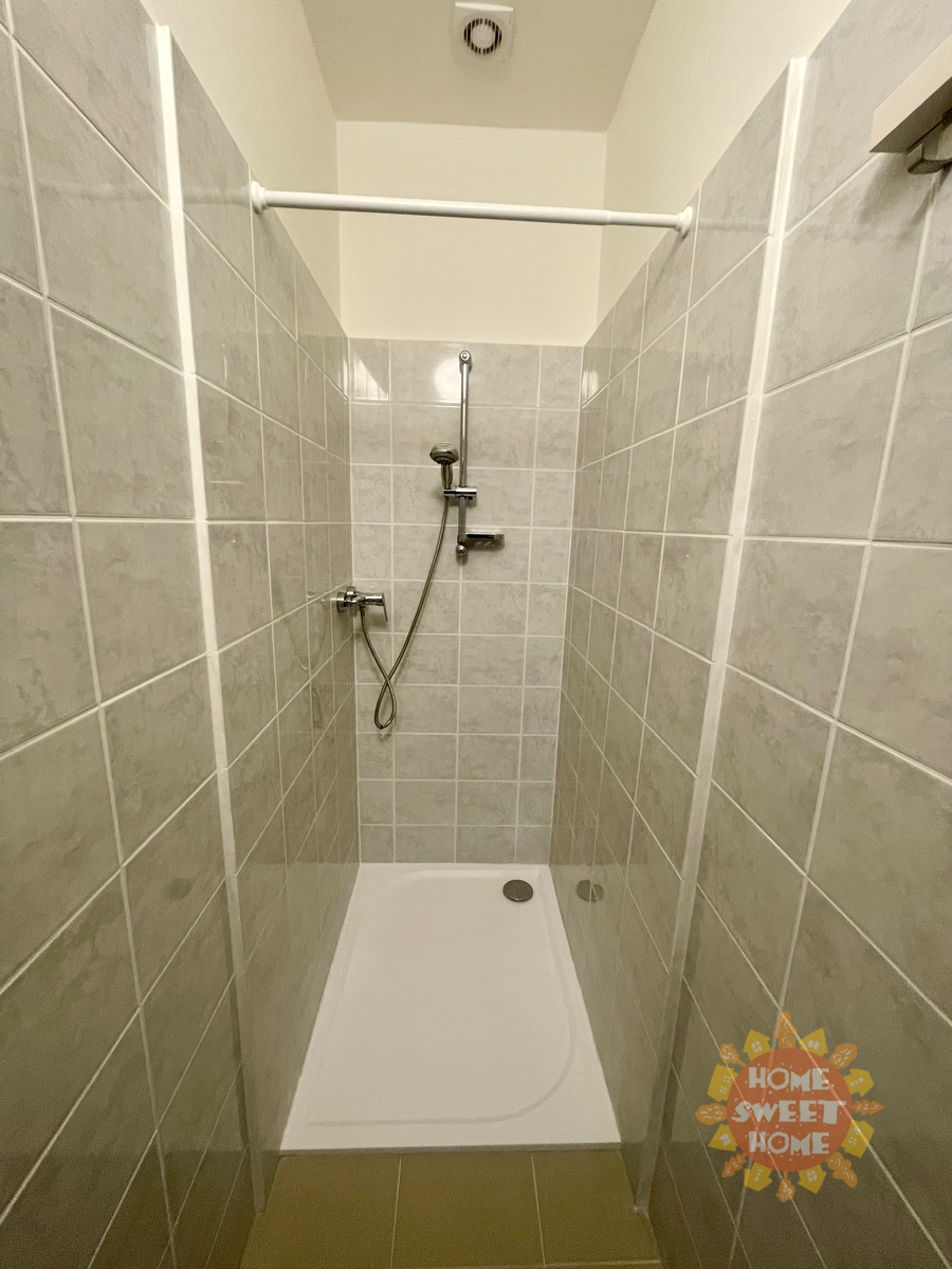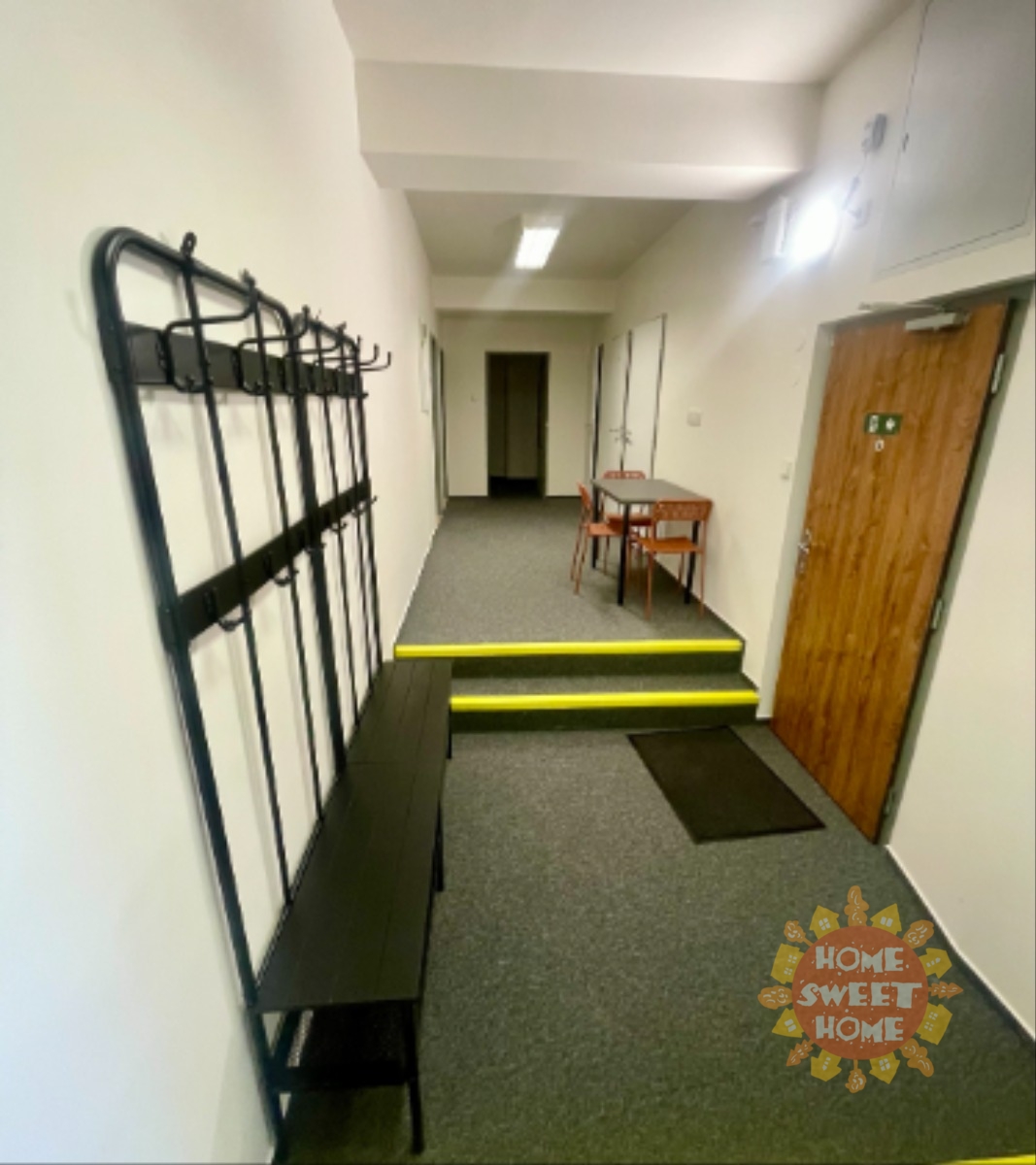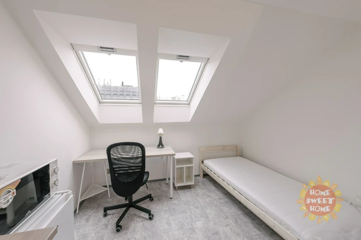 We offer a 14 m² room for rent with a private kitchenette in a shared apartment that has been completely renovated. The apartment is located on the 4th floor of a brick building on Na Žertvách Street, Prague 8 – Palmovka. The room is part of a nine-room apartment, with each room equipped with its own small kitchenette. The shared areas include a fully equipped communal kitchen, a laundry room with a washing machine and dryer, two bathrooms with showers, and three separate toilets. All rooms are modernly furnished with air conditioning, a desk, chair, bedside table, single bed including mattress, and a wardrobe. The service charges also include high-speed internet connection and cleaning of the common areas.