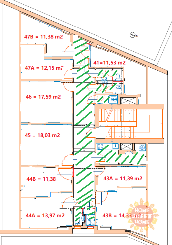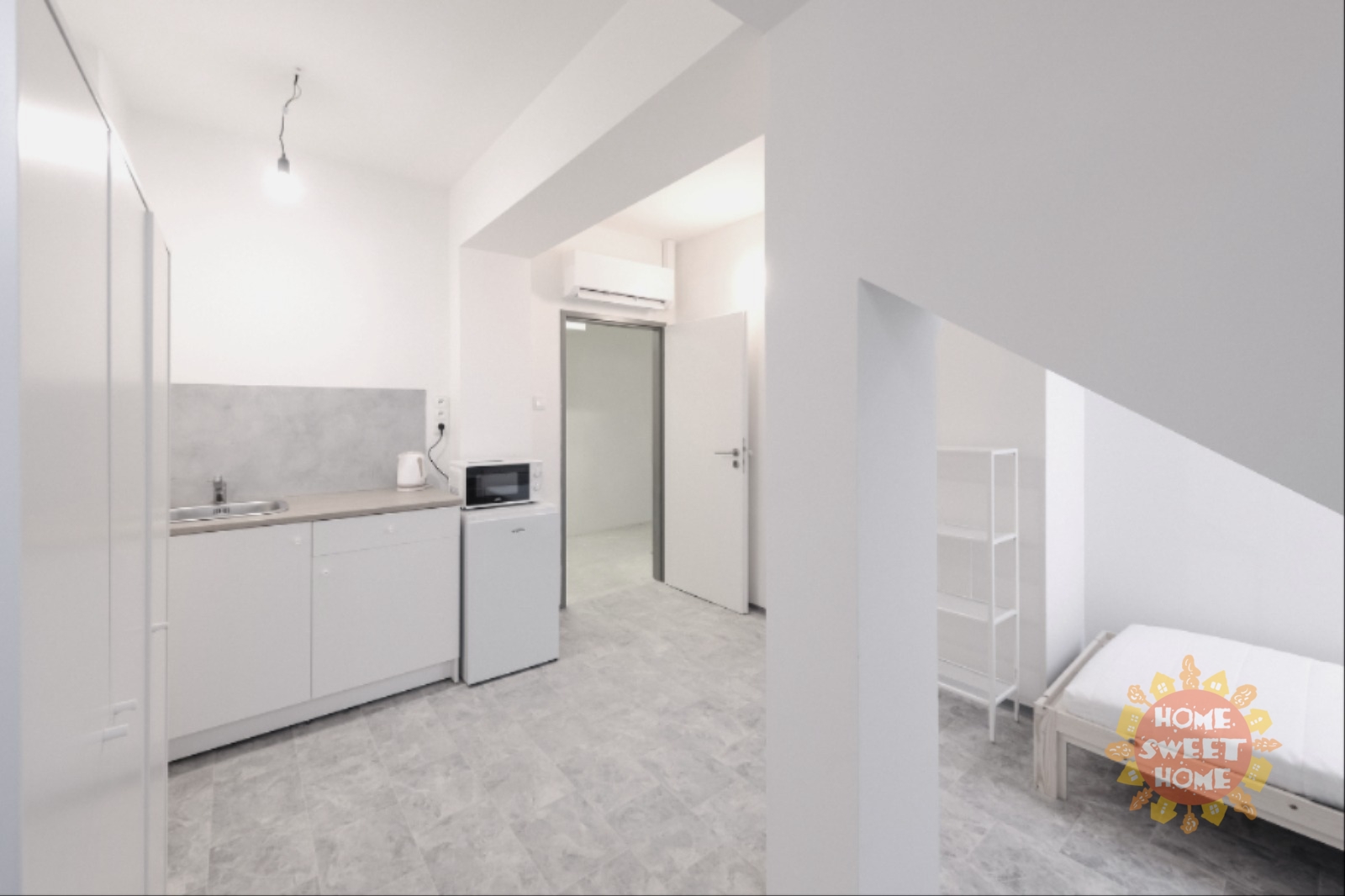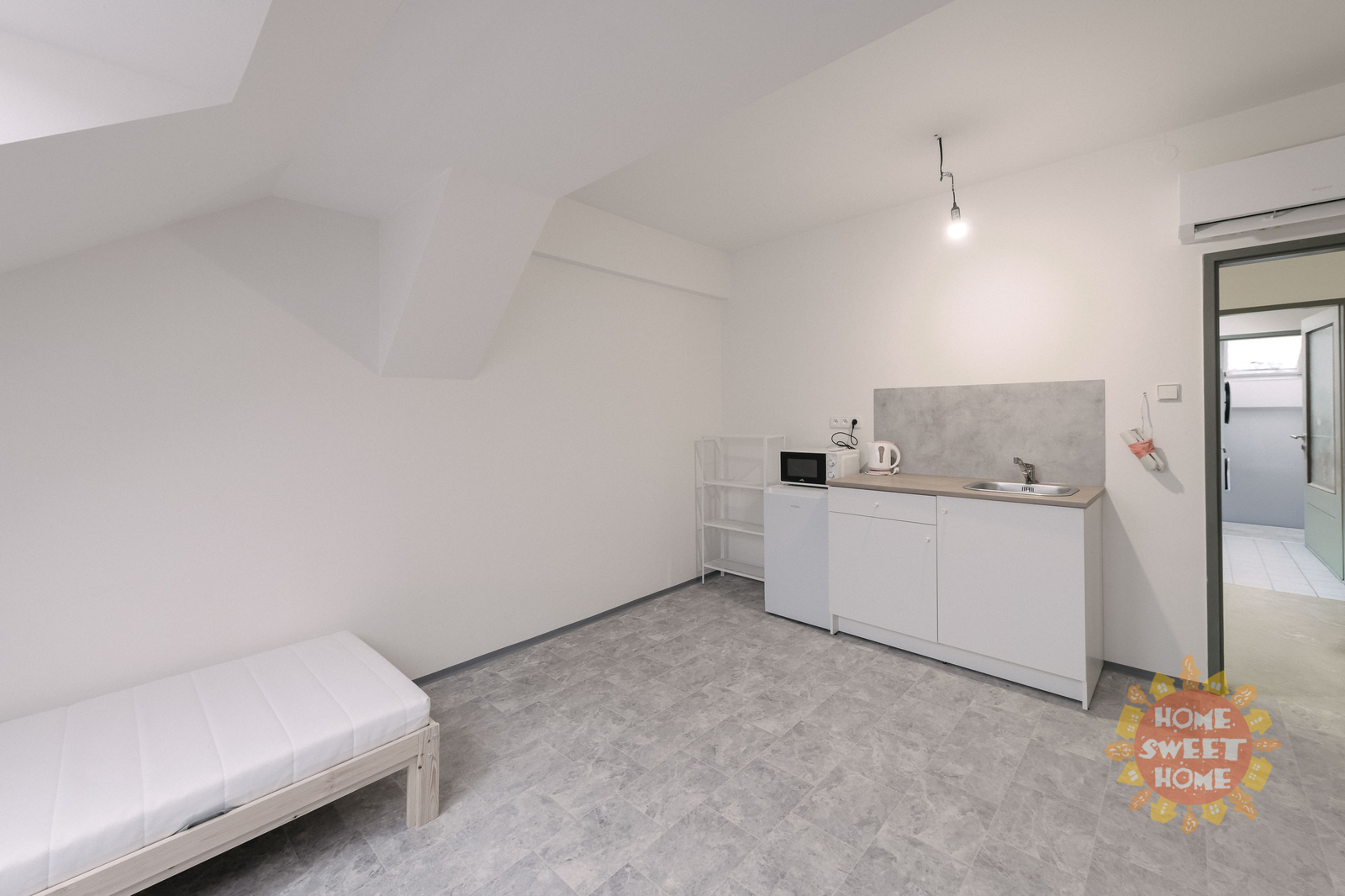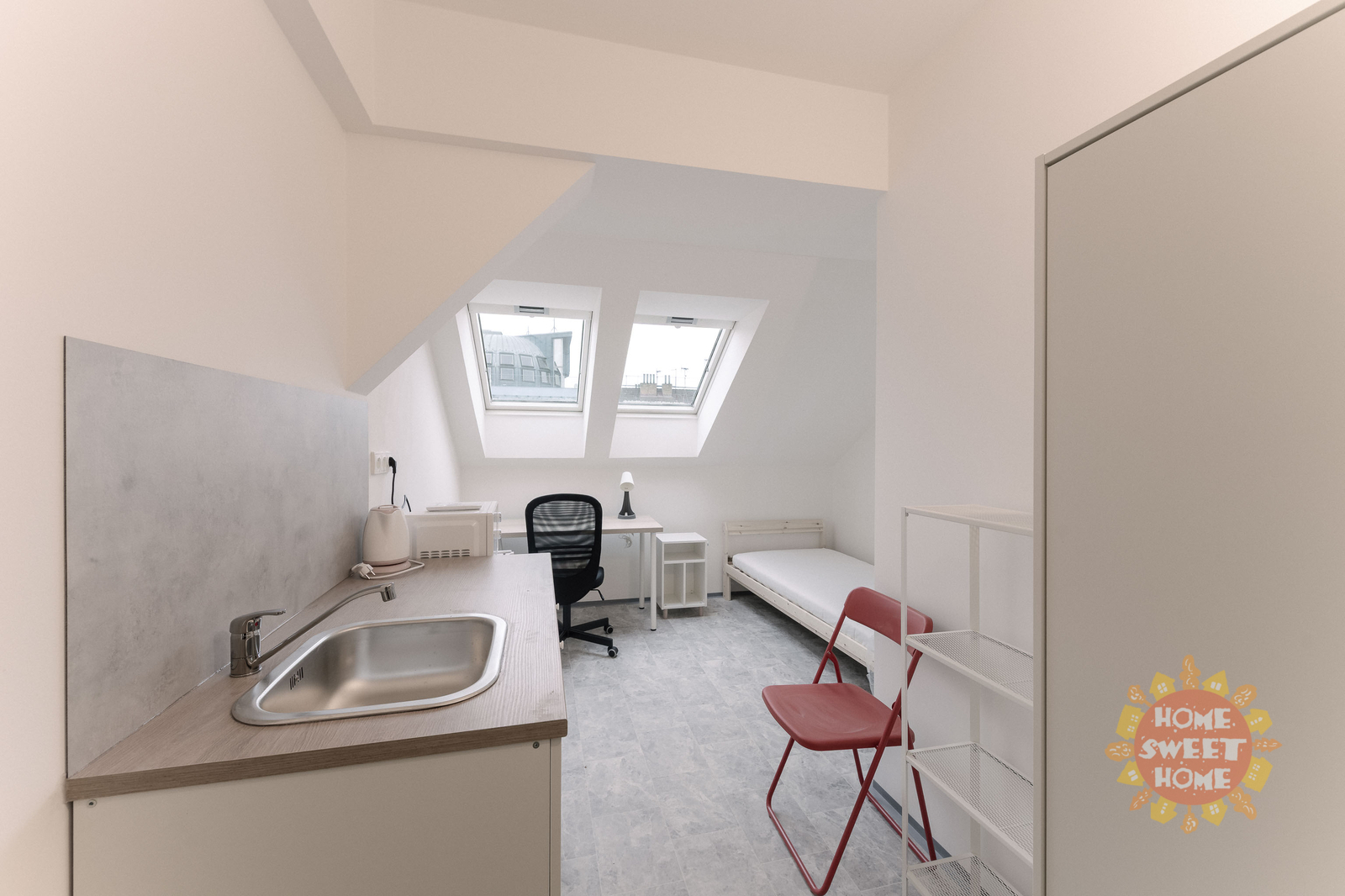 We offer a 14 m² room for rent with a private kitchenette in a shared apartment that has been completely renovated. The apartment is located on the 4th floor of a brick building on Na Žertvách Street, Prague 8 – Palmovka. The room is part of a nine-room apartment, with each room equipped with its own small kitchenette. The shared areas include a fully equipped communal kitchen, a laundry room with a washing machine and dryer, two bathrooms with showers, and three separate toilets. All rooms are modernly furnished with air conditioning, a desk, chair, bedside table, single bed including mattress, and a wardrobe. The service charges also include high-speed internet connection and cleaning of the common areas.