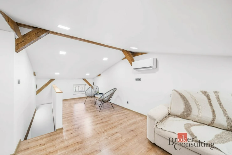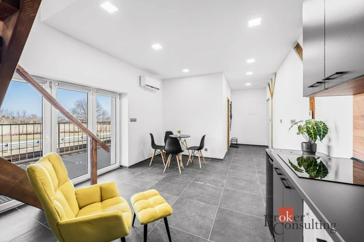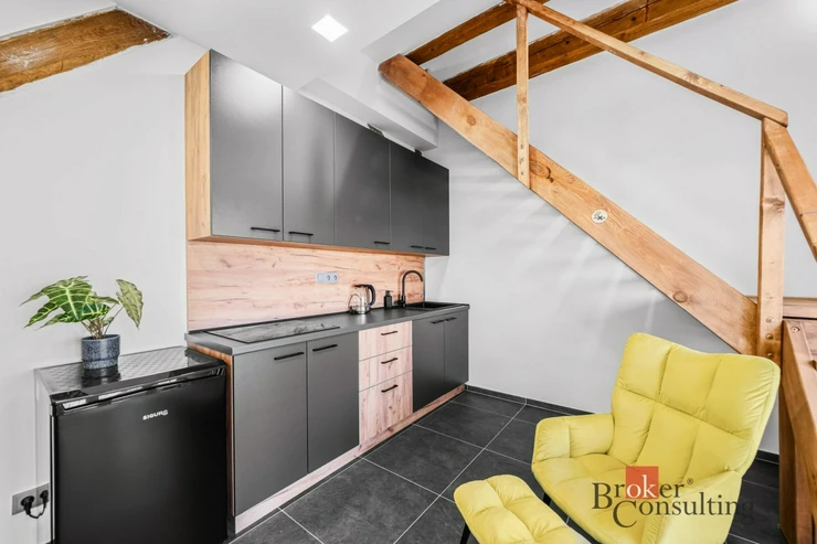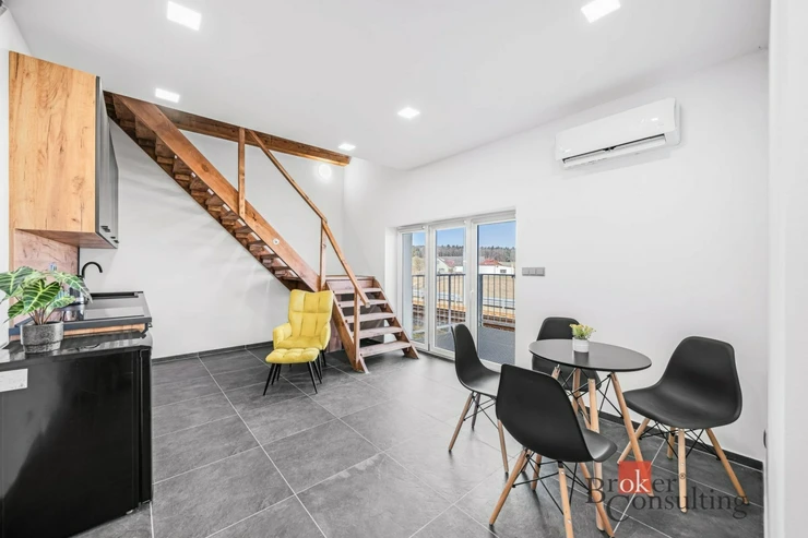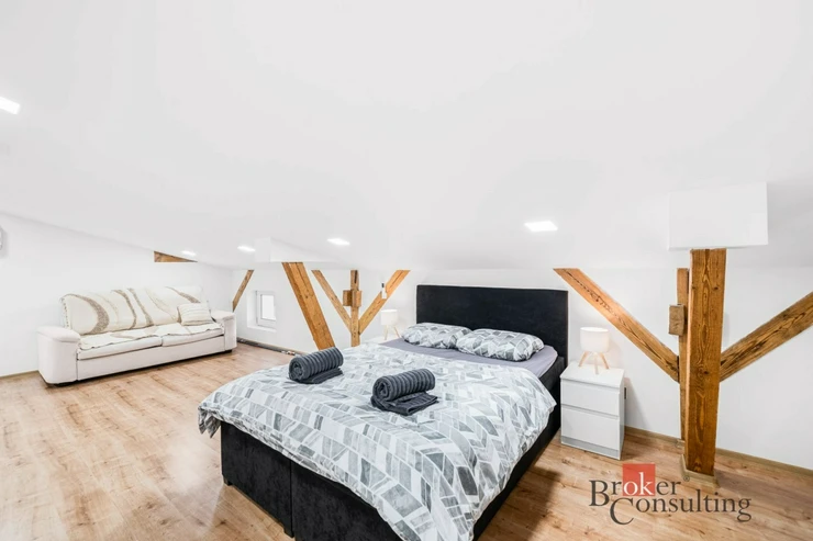Dispozice bytu je rozložena do dvou podlaží. V přízemí se nachází kuchyňský kout s obytným prostorem a koupelna se sprchovým koutem a toaletou. Po schodech se dostanete do patra, kde je umístěna prostorná ložnice. Toto řešení přirozeně odděluje denní a klidovou část bytu a zároveň dodává prostoru vzdušnost a příjemnou atmosféru. Interiér je světlý, moderní a doplněný o dřevěné prvky, které vytvářejí útulný dojem.