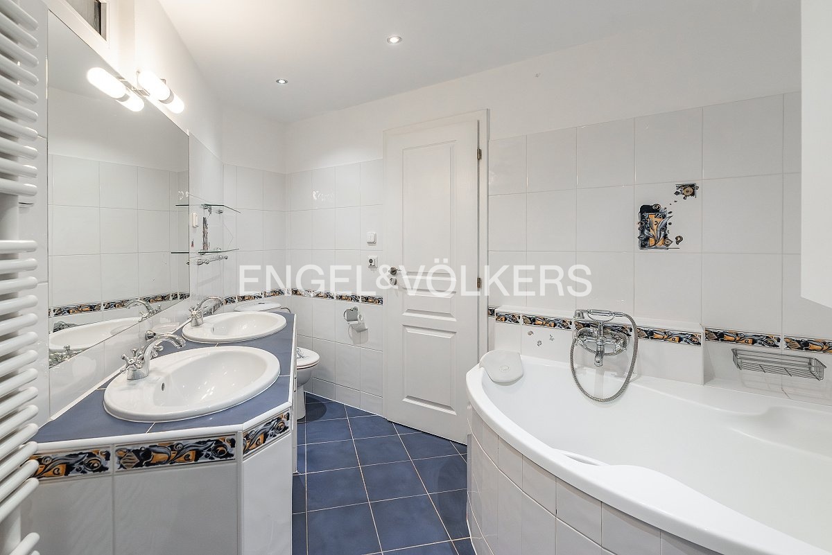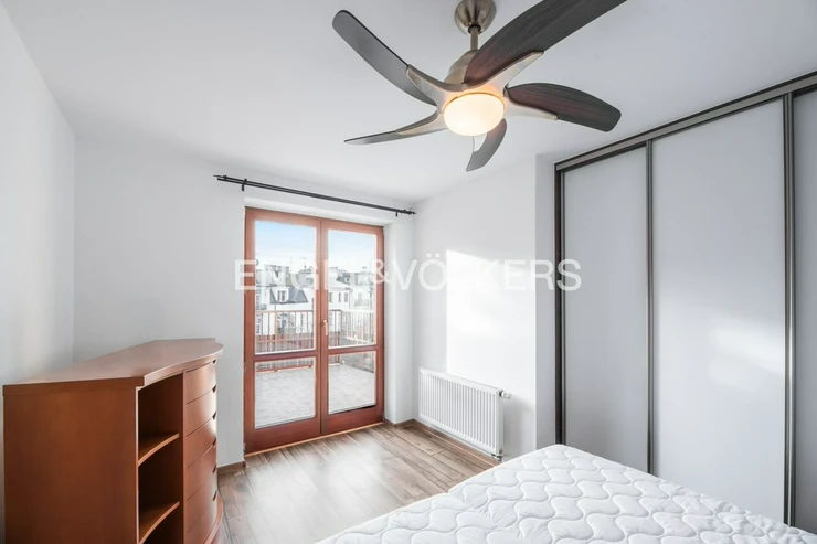 Stairs lead to the upper floor, where there is a master bedroom with built-in storage space, two children's rooms with custom-made furniture, and a spacious bathroom equipped with a bathtub, shower, and toilet. A huge advantage is the spacious sunny terrace facing the courtyard of the building. The apartment is rented fully furnished and is ready for immediate occupancy. The rent includes internet and television.