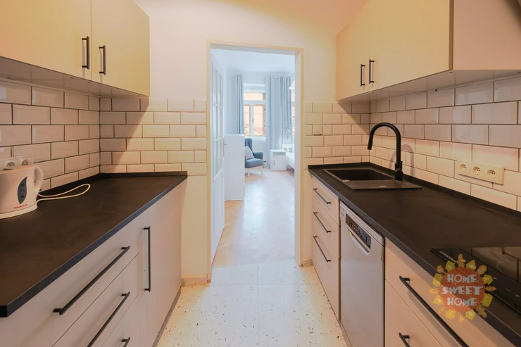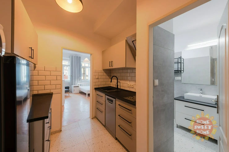 We offer a fully furnished 30 m² apartment for rent, completely renovated. The apartment is located on the 2nd floor of a brick building without an elevator on the quiet Kateřinská Street in Prague 2. The living area is equipped with a bed, desk, wardrobe, and bookshelf. The kitchenette, located in the entrance hall, is fully equipped with a two-burner stove, microwave, dishwasher, and electric kettle. The bathroom includes a shower, toilet, and washer-dryer. The apartment now includes a mobile air conditioner, which is ready for use during the summer months.