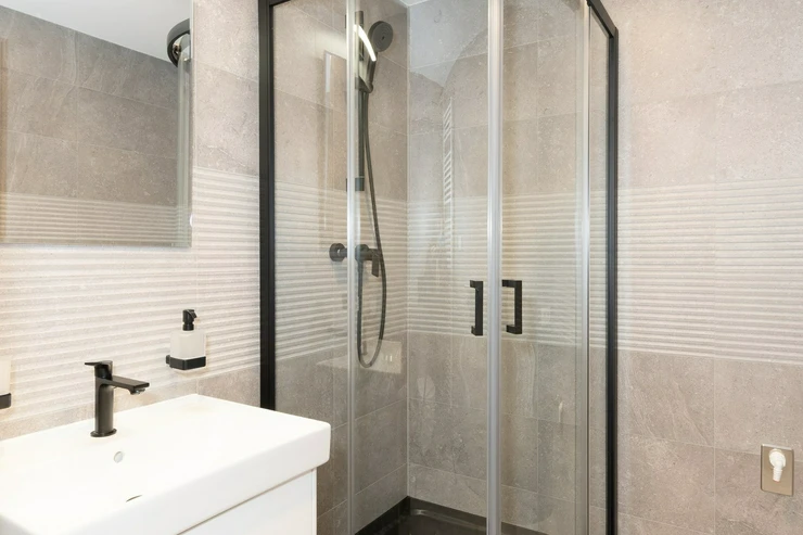 The apartment is situated on the 5th floor and features a bright living area with a kitchenette equipped with modern appliances, including an electric oven, cooktop, extractor hood, refrigerator, and dishwasher. In the entrance hall there is a built-in wardrobe providing practical storage space. The bathroom is fitted with a shower, sink, toilet, and a mirror with lighting.
