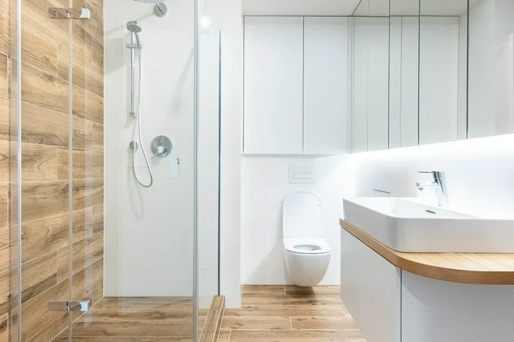 Elegant bathroom. It is equipped with a spacious shower with walk-in entry, a sink with vanity cabinets and a mirror. The washing machine connection is located behind the door. The space is ideal for your personal care and relaxation.