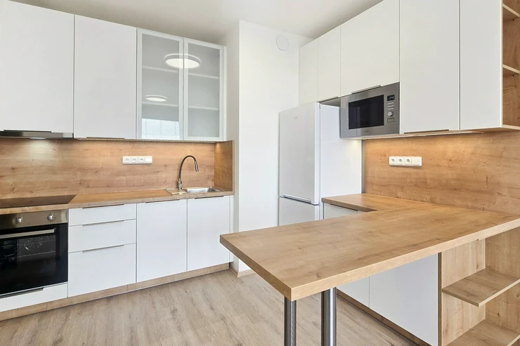 The kitchen is equipped with all necessary appliances: refrigerator, oven, microwave, dishwasher, induction hob, extractor hood, and sink.