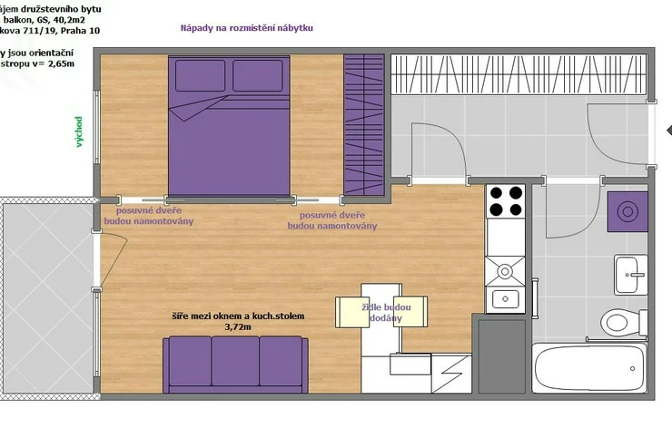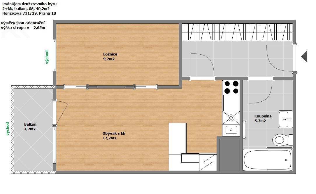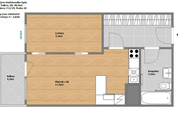 The 2+kk apartment with an area of 40.2 m2 is located on the 4th floor (3rd floor). The windows and loggia face east