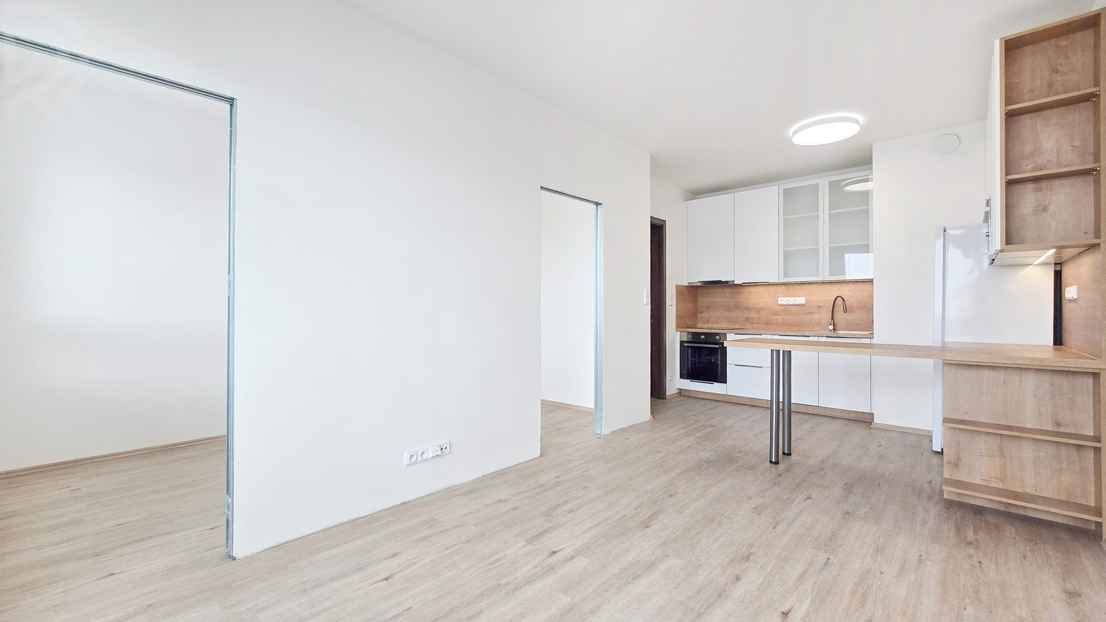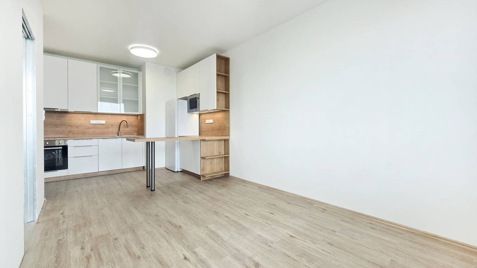 There is a bar counter with 2 chairs. These will be delivered in the coming days, as will the sliding doors to the bedroom.