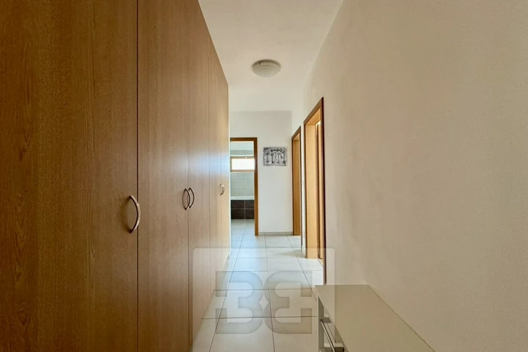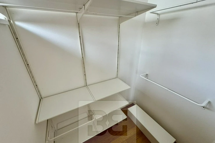 The main highlight of the apartment is the very large living room with an open-plan kitchen, fully furnished with custom-made furniture including a library wall, TV unit, TV table, sofa bed and dining table. The fully equipped kitchen is part of the living space.