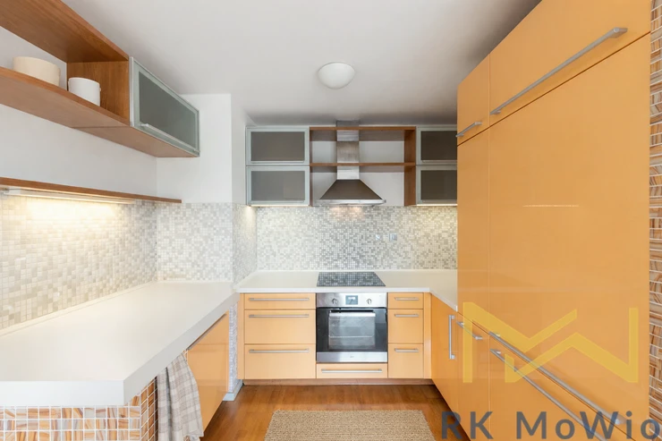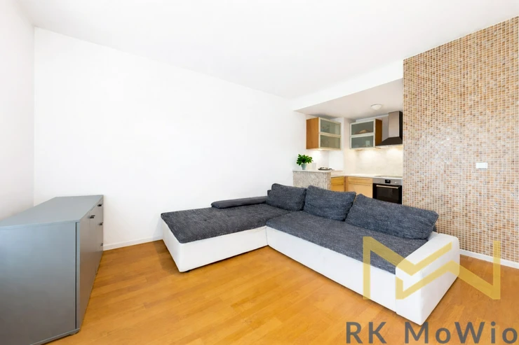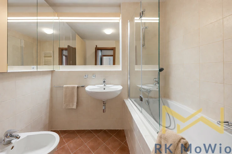 We offer for rent a partially furnished 2-bedroom apartment with a kitchen corner (3+kk) with a floor area of 67 sqm and a balcony of 9 sqm, situated on the 3rd floor (4th above-ground floor) of a modern residential building with an elevator and 24-hour security in the Podvinný mlýn residential project, Prague 9 – Libeň.