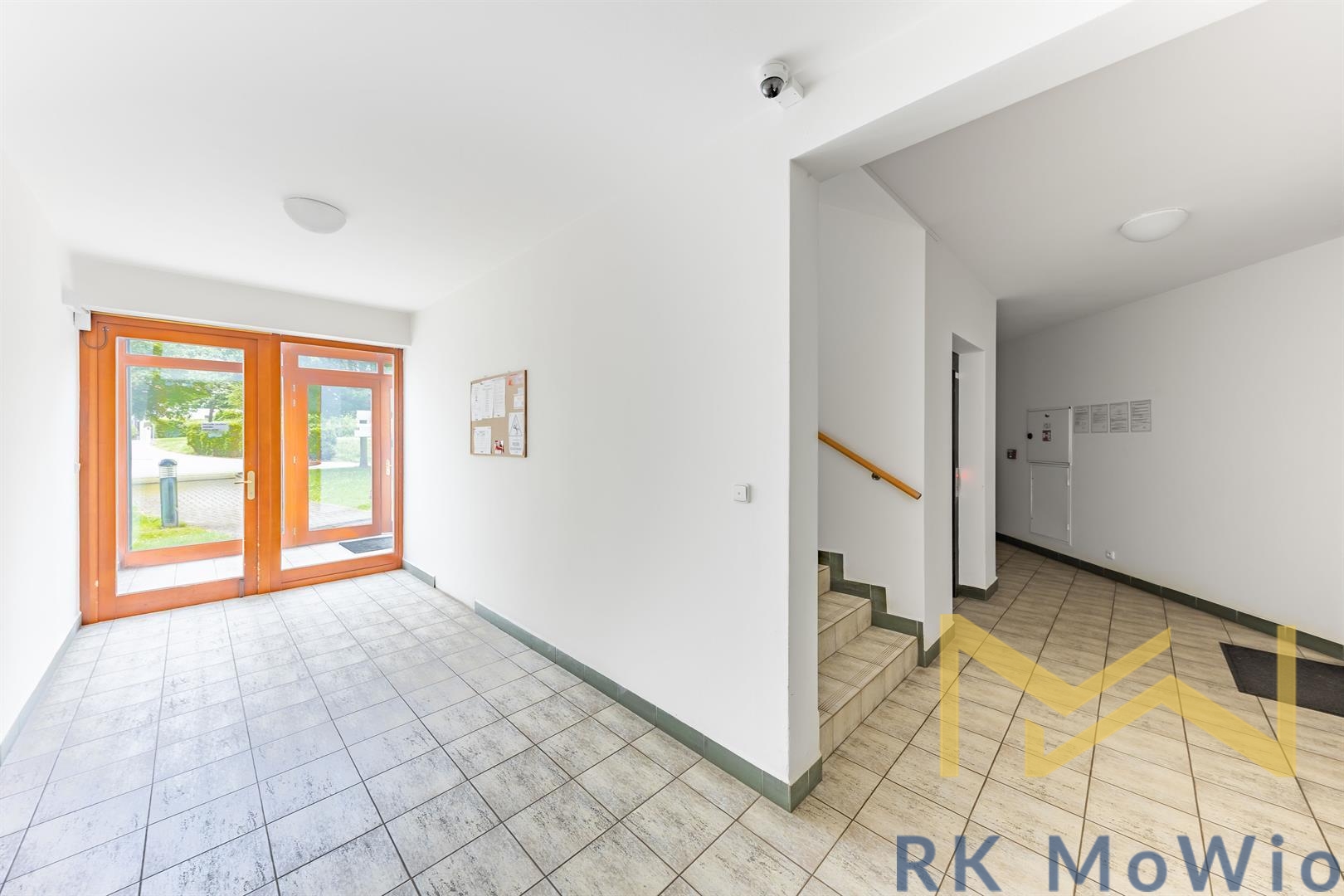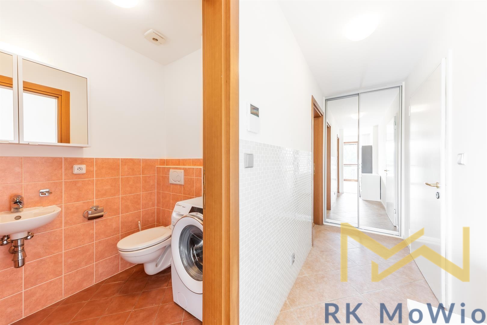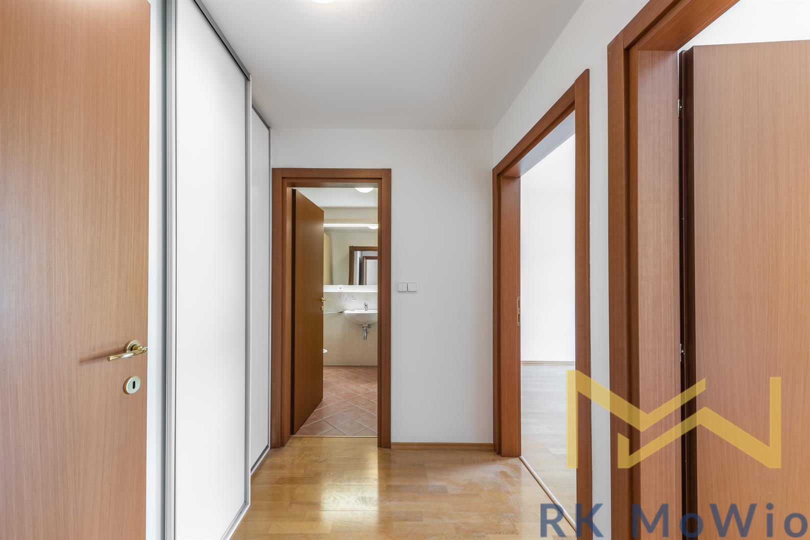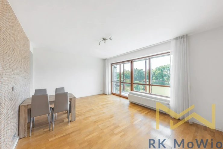 The layout consists of an entrance hall, a separate toilet, a living room with a kitchen corner and dining area with access to a spacious balcony overlooking the park, a hallway leading to the private part of the apartment with two separate bedrooms, and a bathroom (bathtub, washbasin, toilet). The apartment is equipped with a kitchen unit including appliances (fridge with freezer, cooktop, electric oven, dishwasher), built-in wardrobes, a washing machine, preparation for high-speed internet, wooden floors and tiles. A storage cellar and garage parking space in the building are included with the apartment.