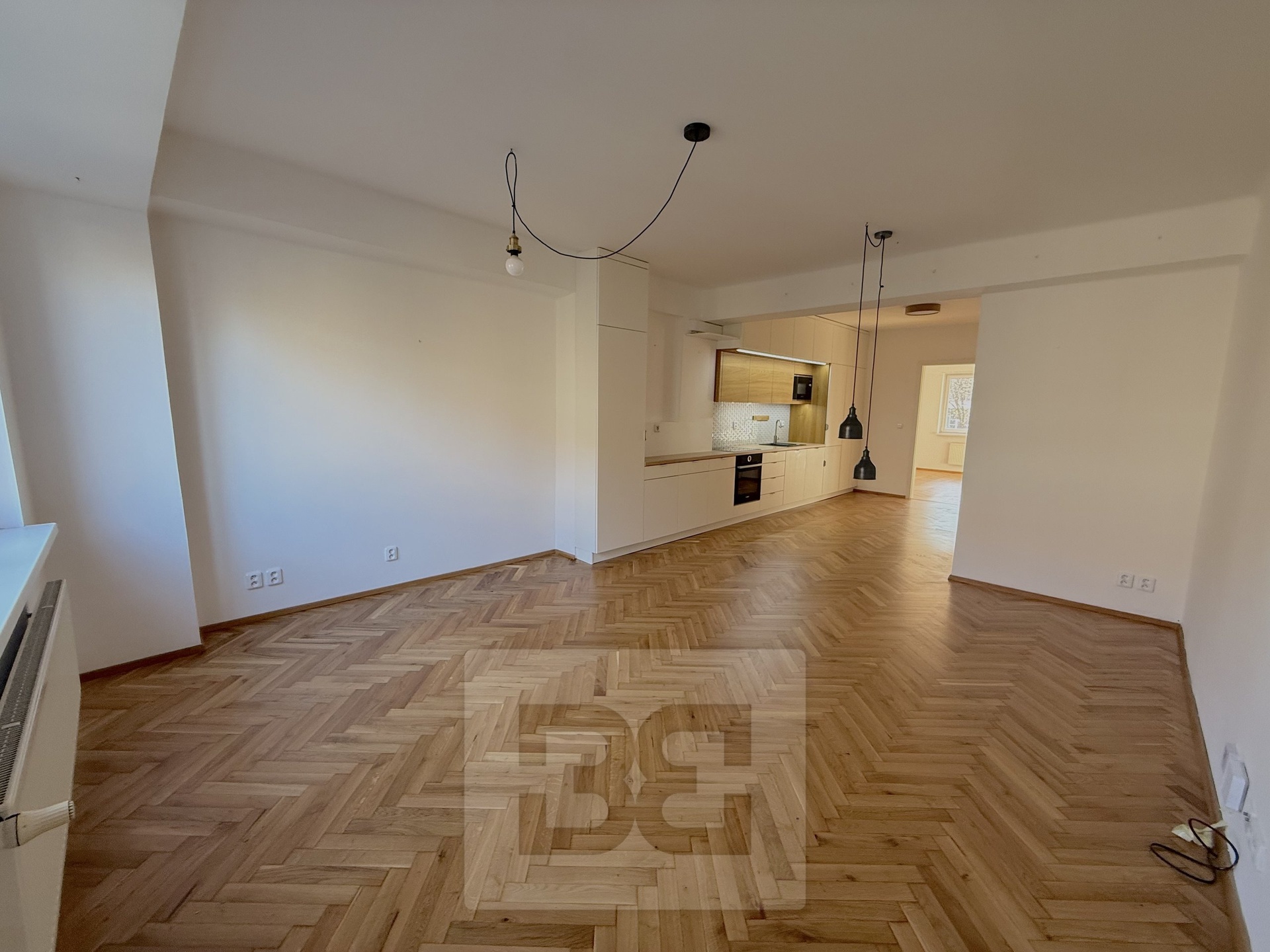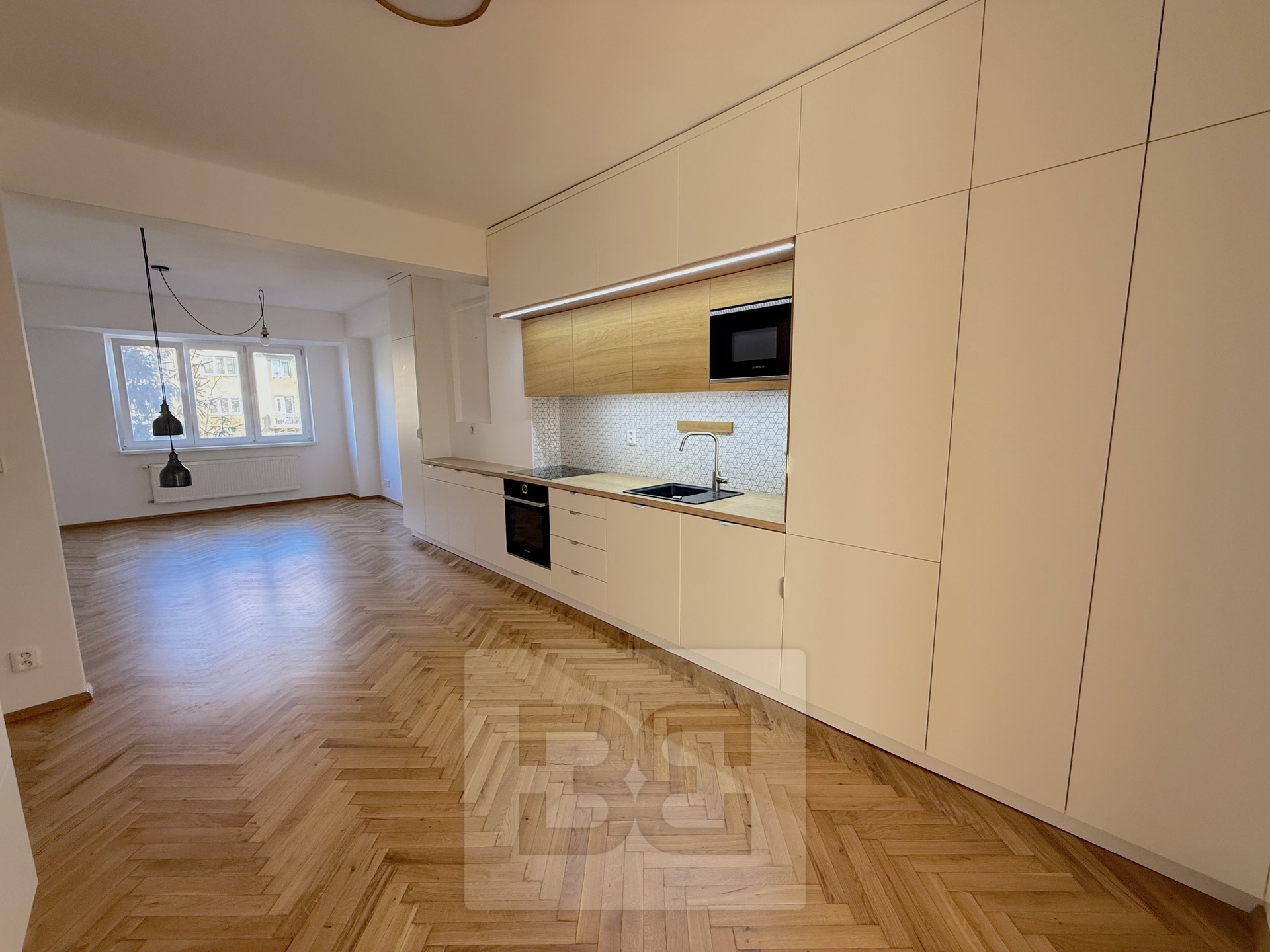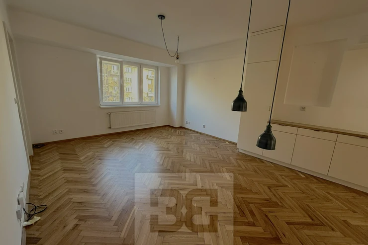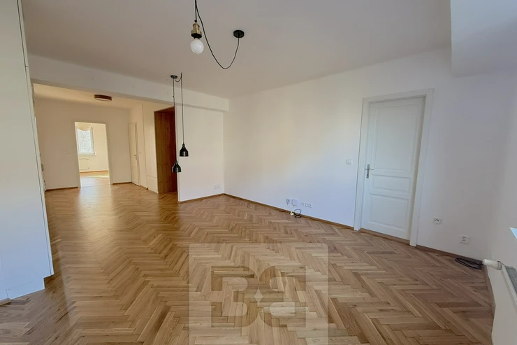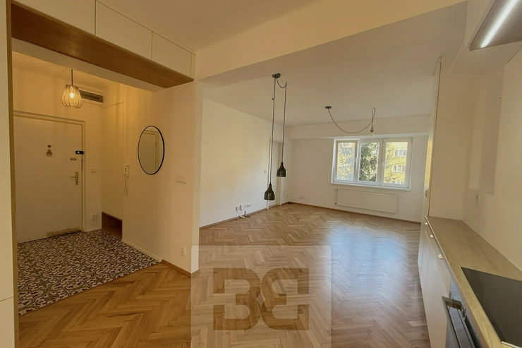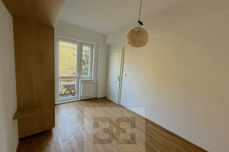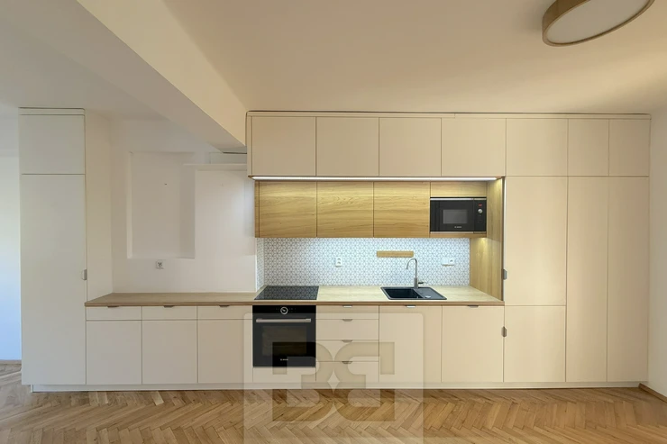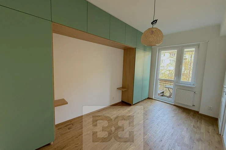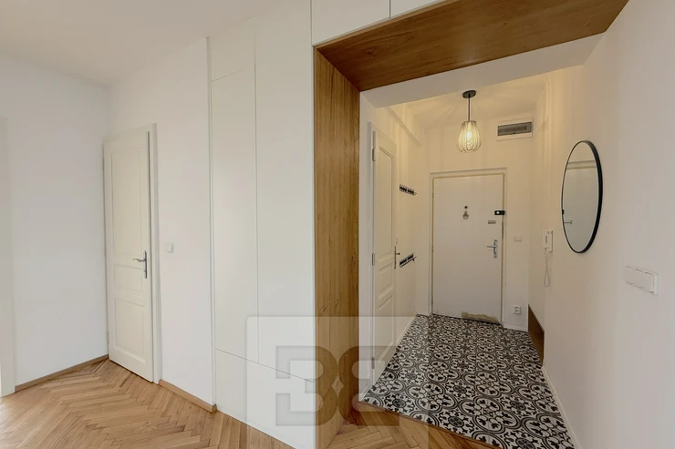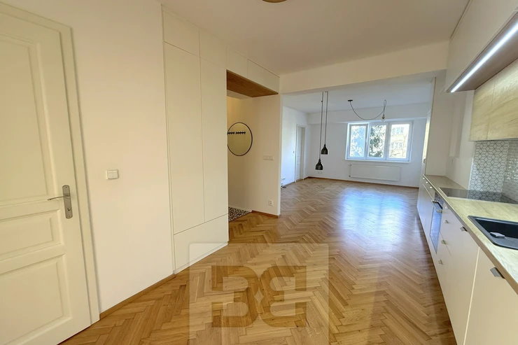We offer for rent a beautiful, fully renovated 3+kk apartment of 72m², located in a brick building with an elevator. The apartment impresses with its abundance of built-in storage spaces. The building is situated on a quiet, one-way street.