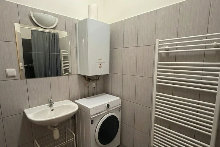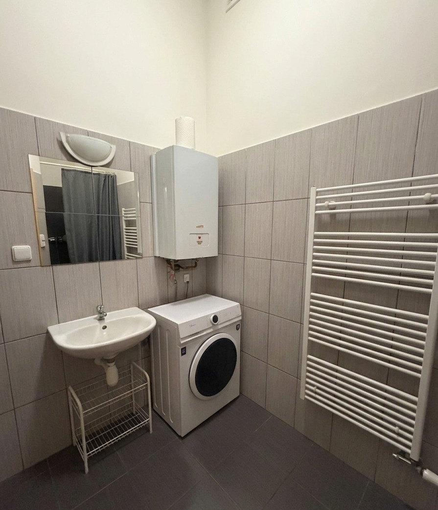 The apartment has a 2+kk layout and consists of a living room with a kitchen area, a bedroom, a bathroom, and a separate toilet. The kitchen is fully equipped with appliances, including a dishwasher. The bathroom features a shower cabin and a washing machine. Heating is provided by an individual gas boiler.