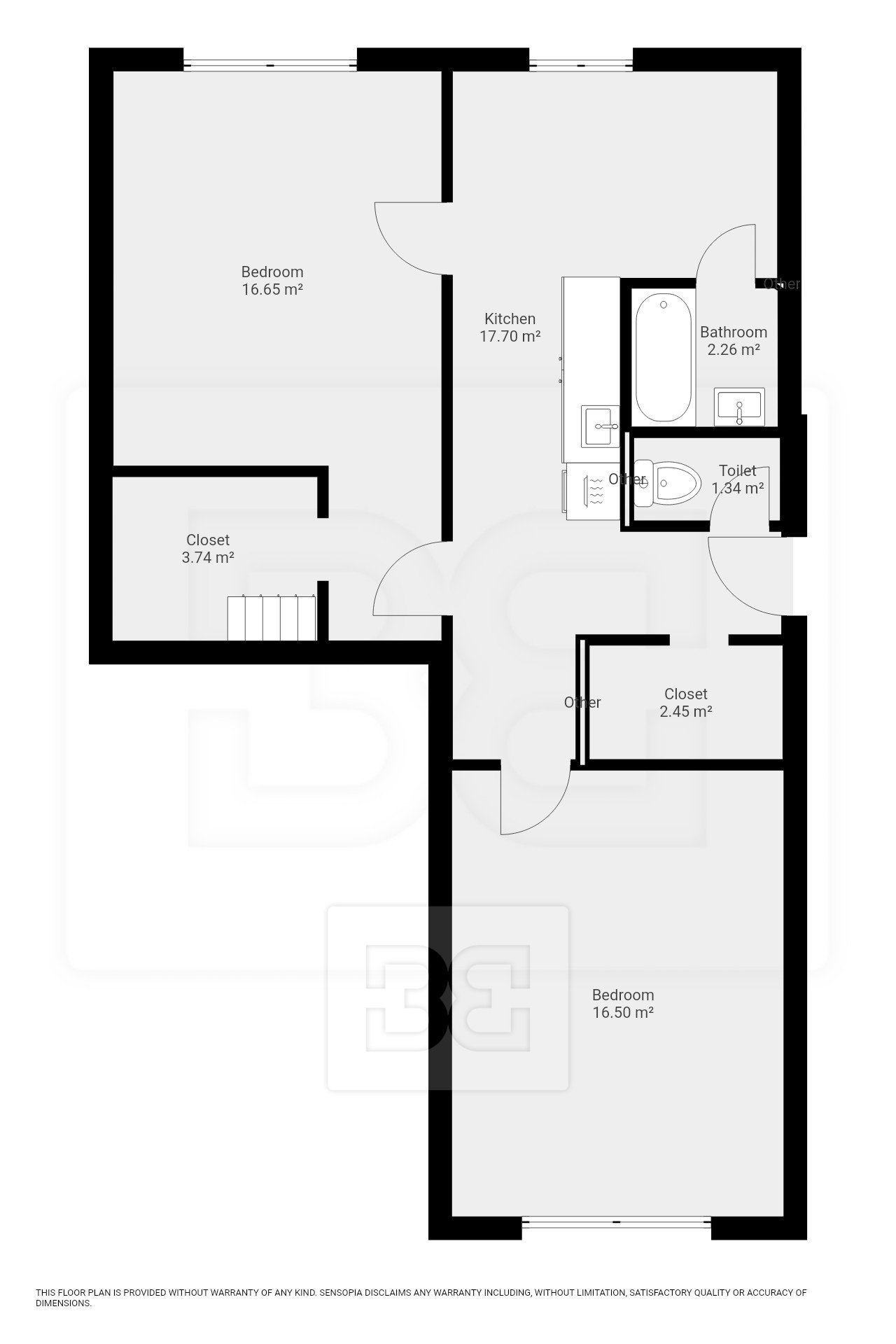 The apartment has a practical layout. The disposition includes two separate bedrooms, one of which has direct access to a walk-in closet and is located right next to the kitchen. The bathroom is situated behind the kitchen, while the toilet is separate.
