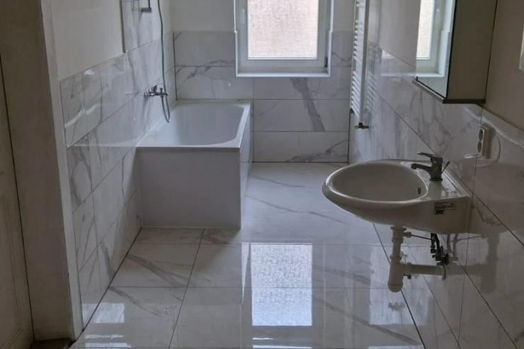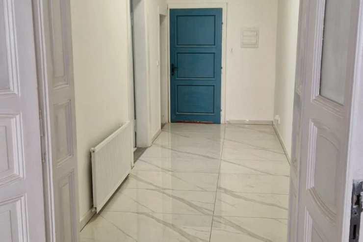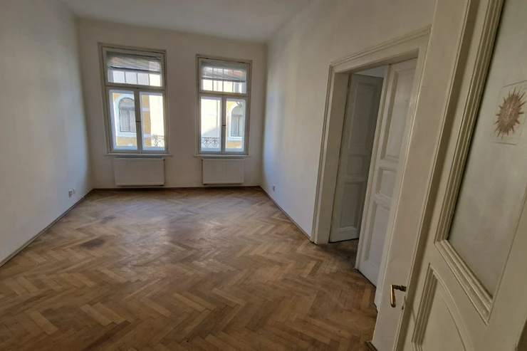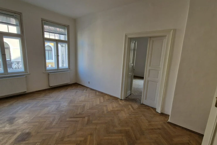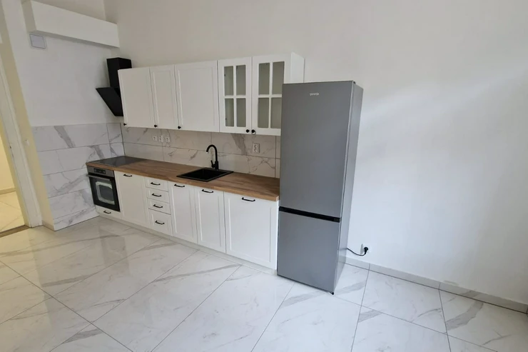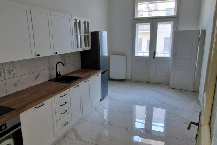 Kuchyně je moderní, s vestavěnými spotřebiči. Z kuchyně je přístup na balkon, situovaný směrem do dvora a na jižní stranu. Na podlahách jsou původní, renovované parkety a dlažba. Celkově byt působí velmi světlým a prostorným dojmem – kombinuje prvky historické architektury s moderním standardem bydlení.