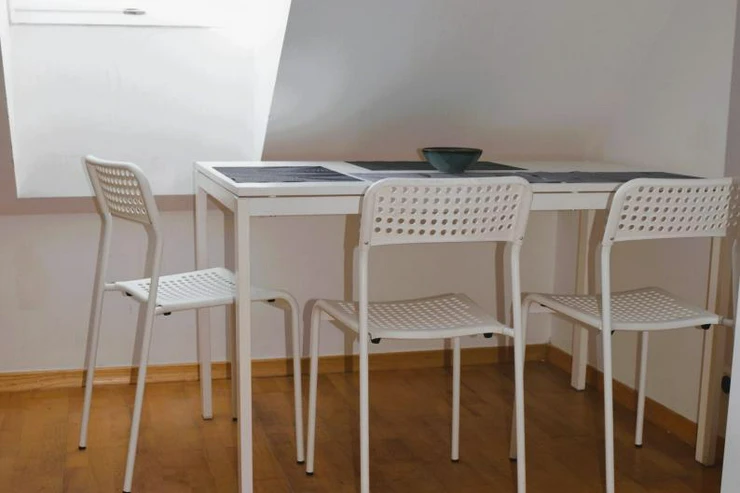 Fully equipped kitchen: electric oven, microwave, refrigerator, dishwasher, basic kitchenware, dining table and chairs