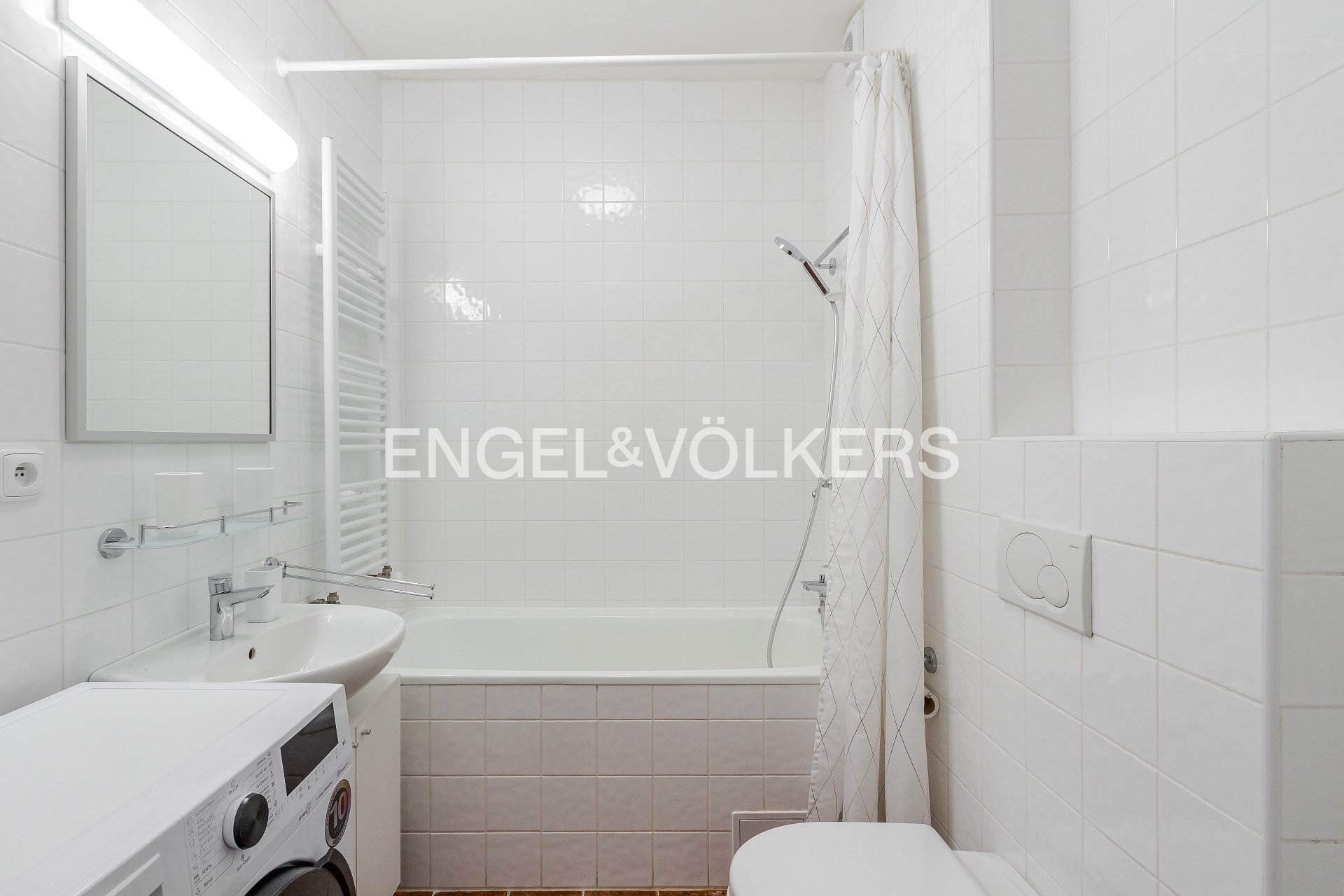 The apartment features a living room, a separate furnished kitchen, a bedroom, a smaller room, an entryway, and a bathroom with a bathtub. The apartment is rented fully furnished and equipped, including an LCD TV, washing machine, curtains, drapes, bedding, and decorations. The kitchen is fully equipped with appliances—a dishwasher, a glass-ceramic cooktop, a convection oven, a range hood, a microwave, a refrigerator with a freezer, and dishes.