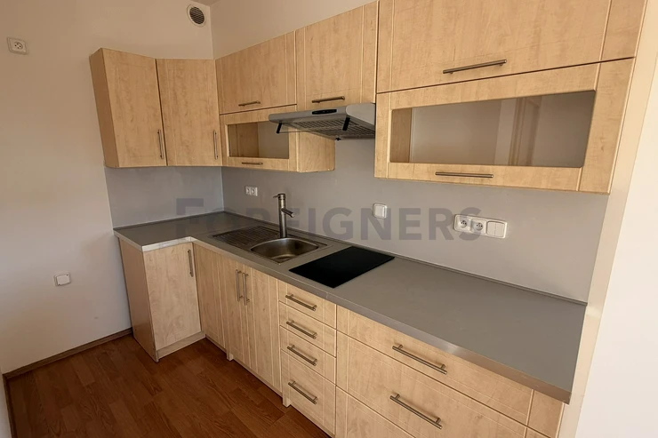The apartment is offered unfurnished, except for the kitchen area which includes a kitchen unit and stove. A built-in wardrobe is located in the hallway and there is a cabinet in the bathroom. The landlord can provide a washing machine if required.