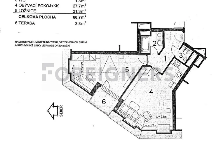 The layout consists of a living room with a kitchenette, one bedroom, bathroom, hallway and terrace. The space allows a possible modification into a compact 3+kk layout by separating part of the living area.