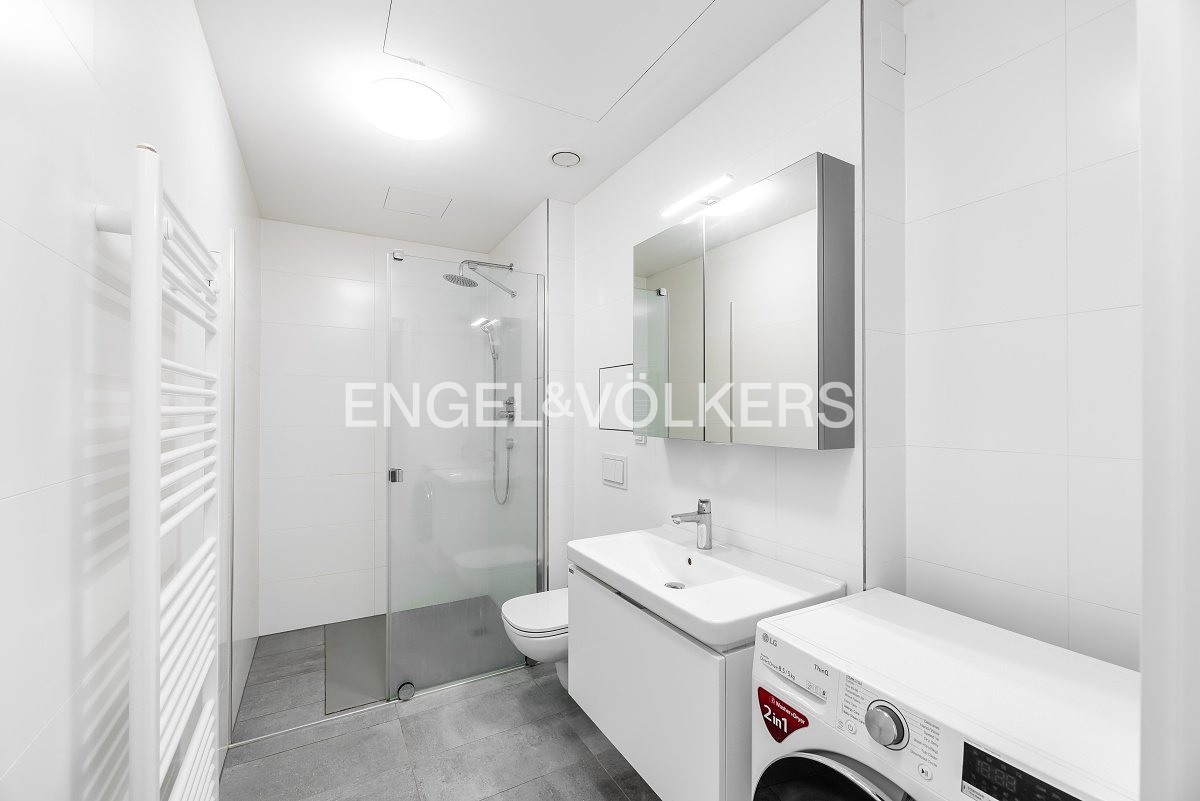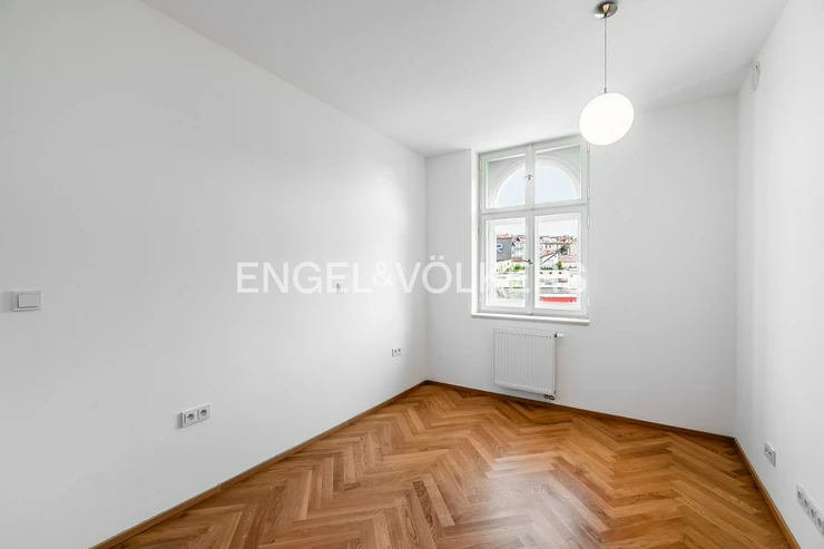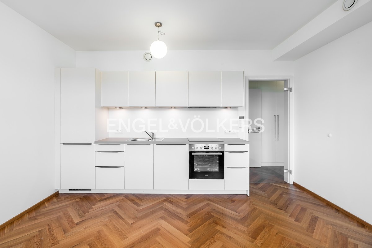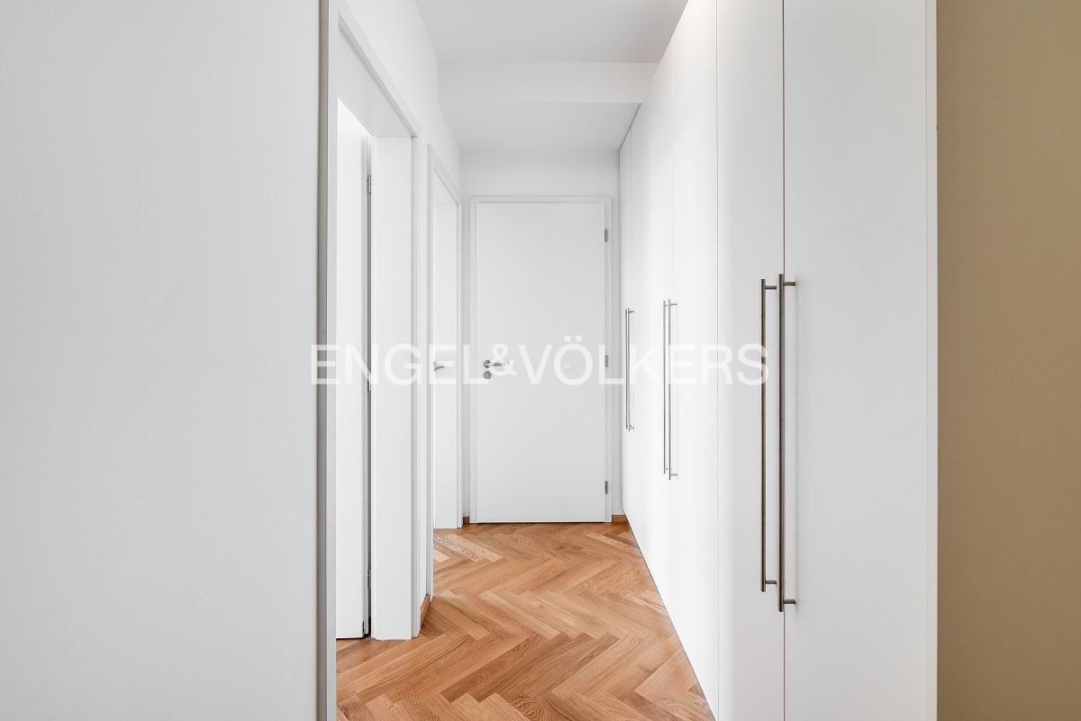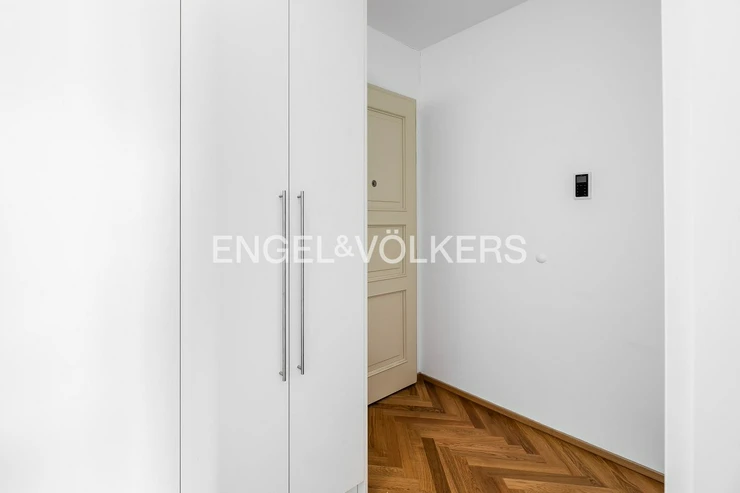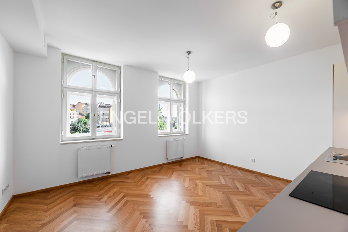 The apartment is located in a renovated apartment building with a lift and a cellar and consists of a spacious entrance hall with built-in wardrobes, the living room is connected to a fully equipped kitchen. From the living room, a full bedroom is accessible