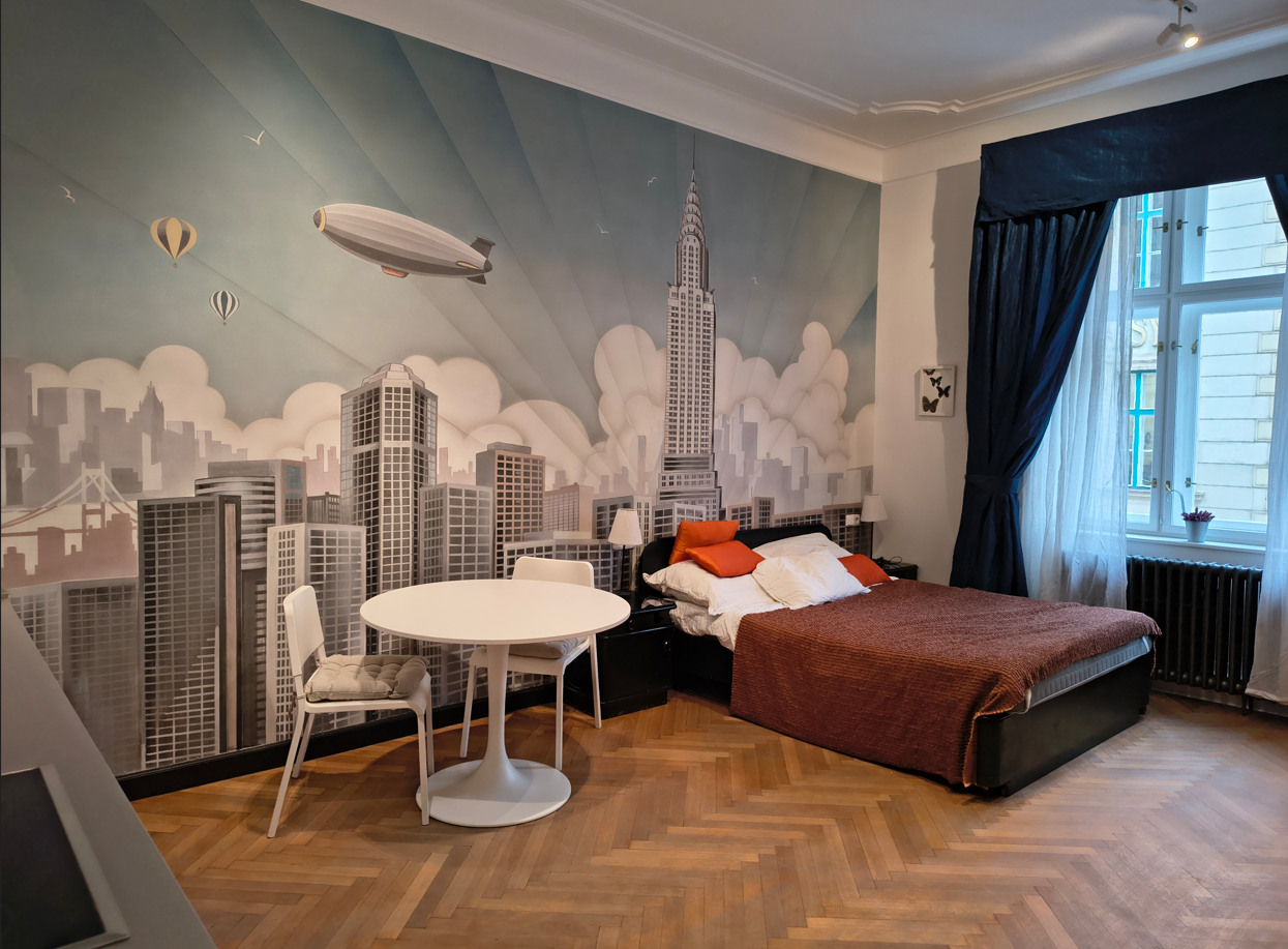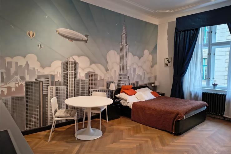 The apartment is fully furnished and ready for immediate move-in. One of its unique features is an original wall mural, giving the interior a distinctive character.