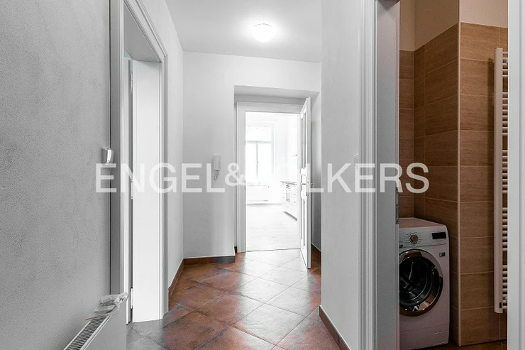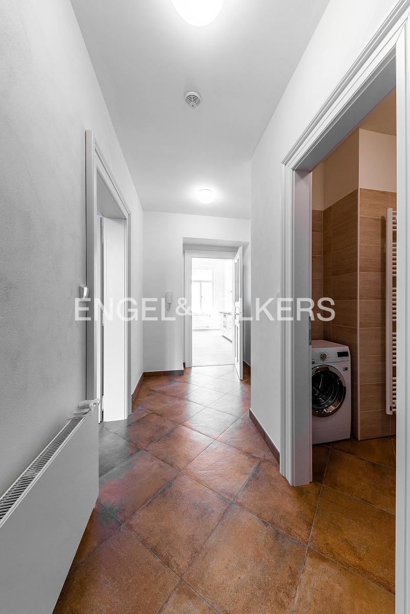 The heart of the apartment is a spacious, bright living room with a fully equipped kitchenette, which faces a quiet street. The bedroom has a spacious built-in wardrobe. The bathroom has a bathtub with a shower screen and a washing machine. The apartment also has a spacious hall that separates all the rooms.
