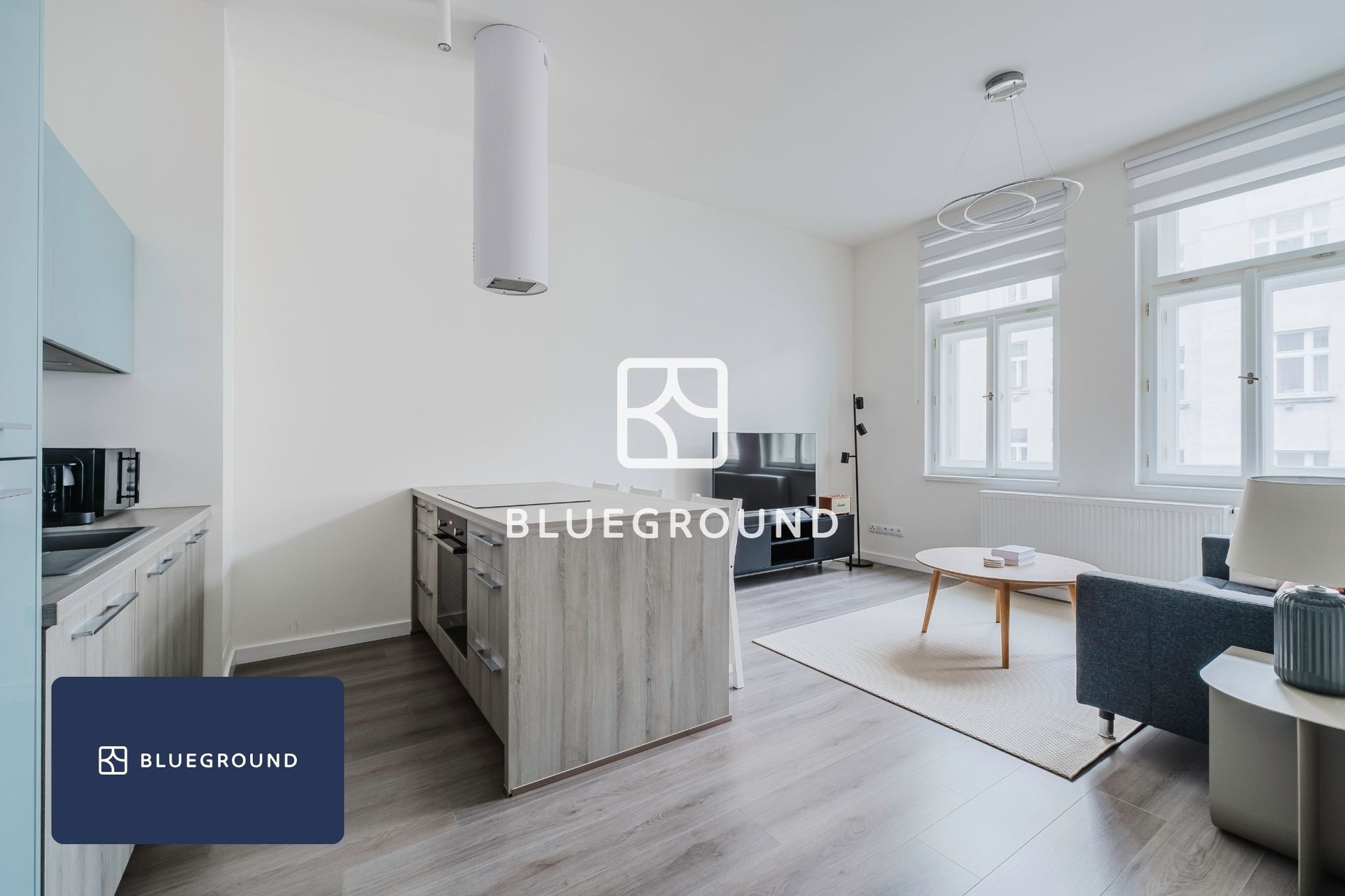 Blueground offers a modern 2+kk apartment (50 m²) in Žižkov, designed for productive and comfortable living. Enjoy flexible stays from one month, a dedicated workspace, and high-speed Wi-Fi included — ideal for focused work and relaxed living.
