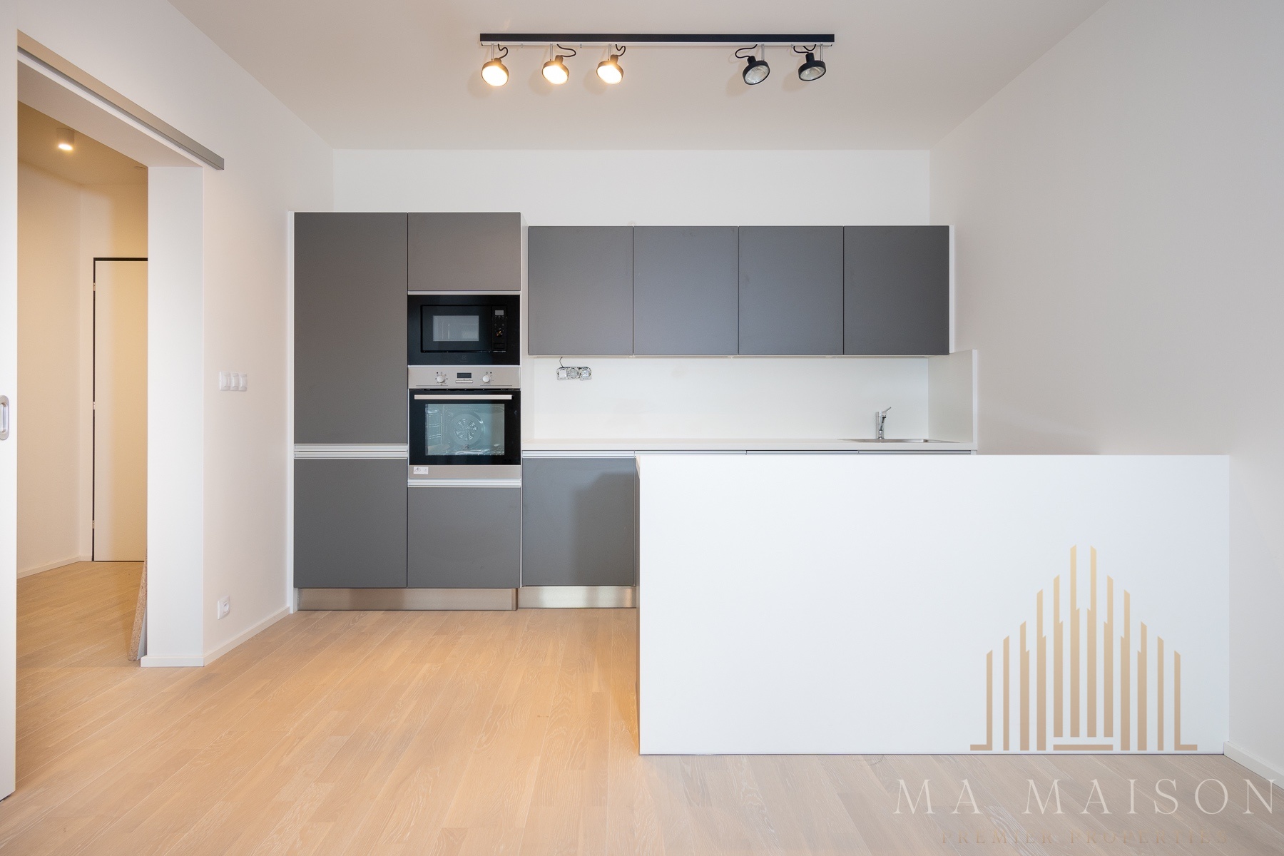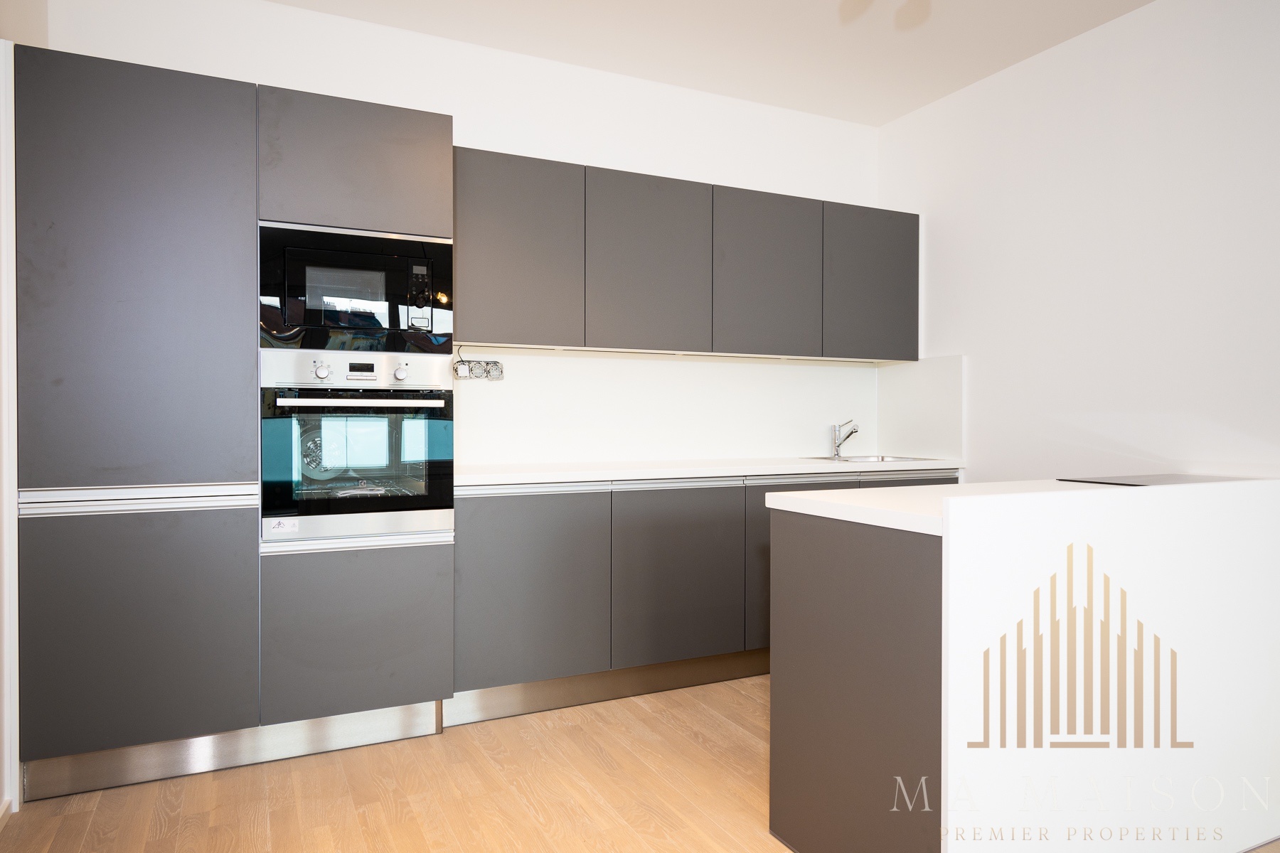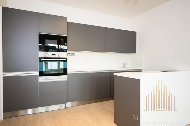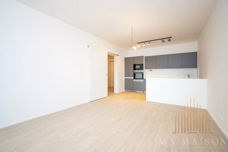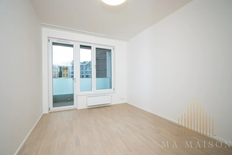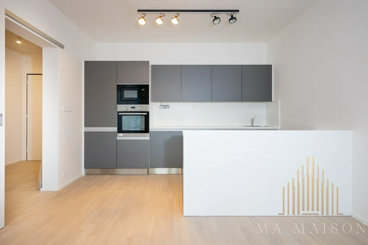 The apartment is offered as unfurnished and consists of an entrance hall, storage room, bathroom, toilet, living area, which is connected to the kitchen and two other rooms. The living room includes a kitchen which is equipped with a fridge-freezer, hob, oven, microwave and dishwasher. All appliances are Electrolux. The line is divided into two parts, where the part where the hob is located is on a separate bar. At the same time, the line offers plenty of storage space.