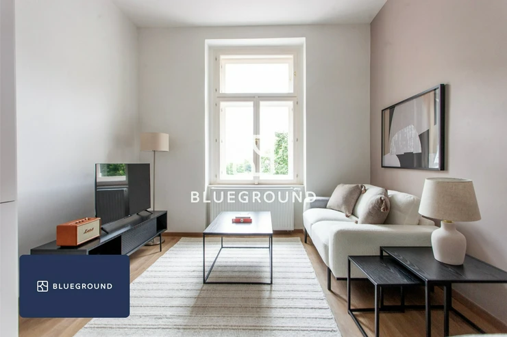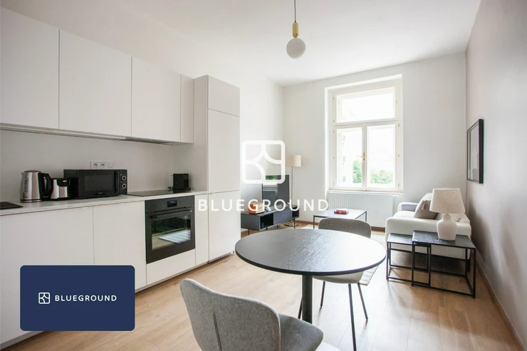 Blueground offers this modern 2+kk apartment on Rostovská Street in Vršovice with the option to rent from one month to a year. The apartment is fully furnished, professionally managed and ready to move in immediately, which is ideal if your plans may change.