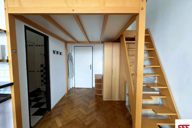 Main room with a kitchenette and a built-in loft bed, furnished with basic furniture as shown in the photos.