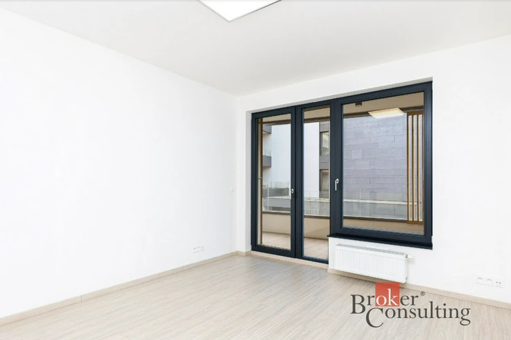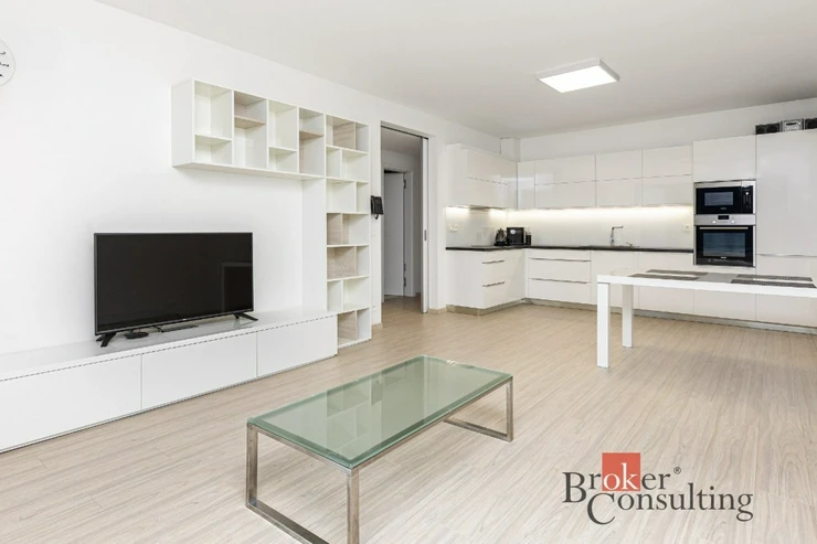 Dispozice bytu Dominantou bytu je prostorný obývací pokoj o velikosti 30 m², který je propojený s designovou kuchyní a vybavený přístupem na terasu. Terasa je osazena kvalitními prkny z dřevěného kompozitu a přístup na ni je možný nejen z obývacího pokoje, ale i z jednoho z neprůchozích pokojů. Kuchyně je plně vybavena moderními spotřebiči značky Siemens (elektrická trouba, chladnička s mrazákem, myčka, indukční varná deska, mikrovlnná trouba) a nabízí dostatek prostoru pro jídelní stůl.