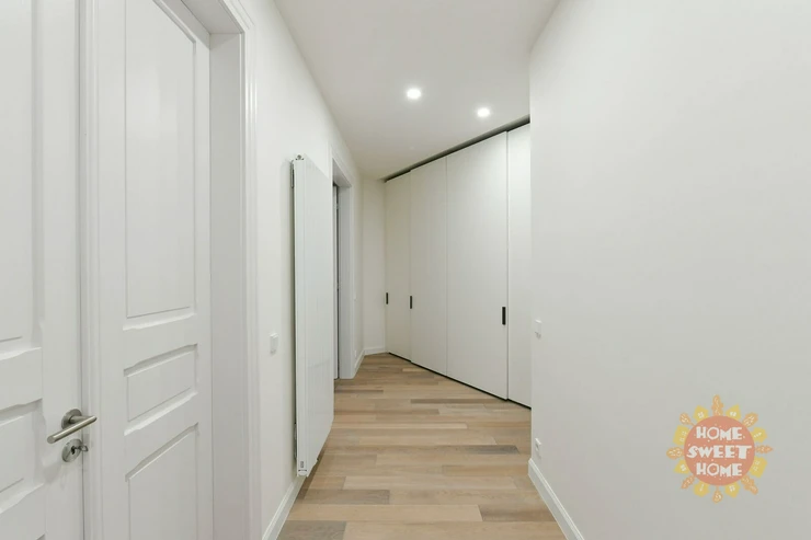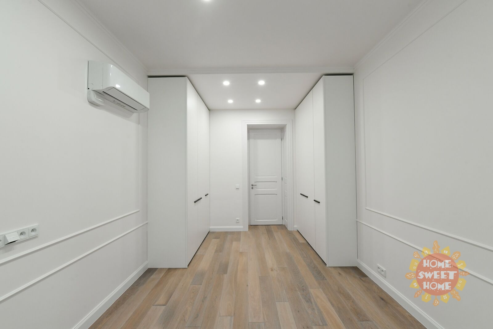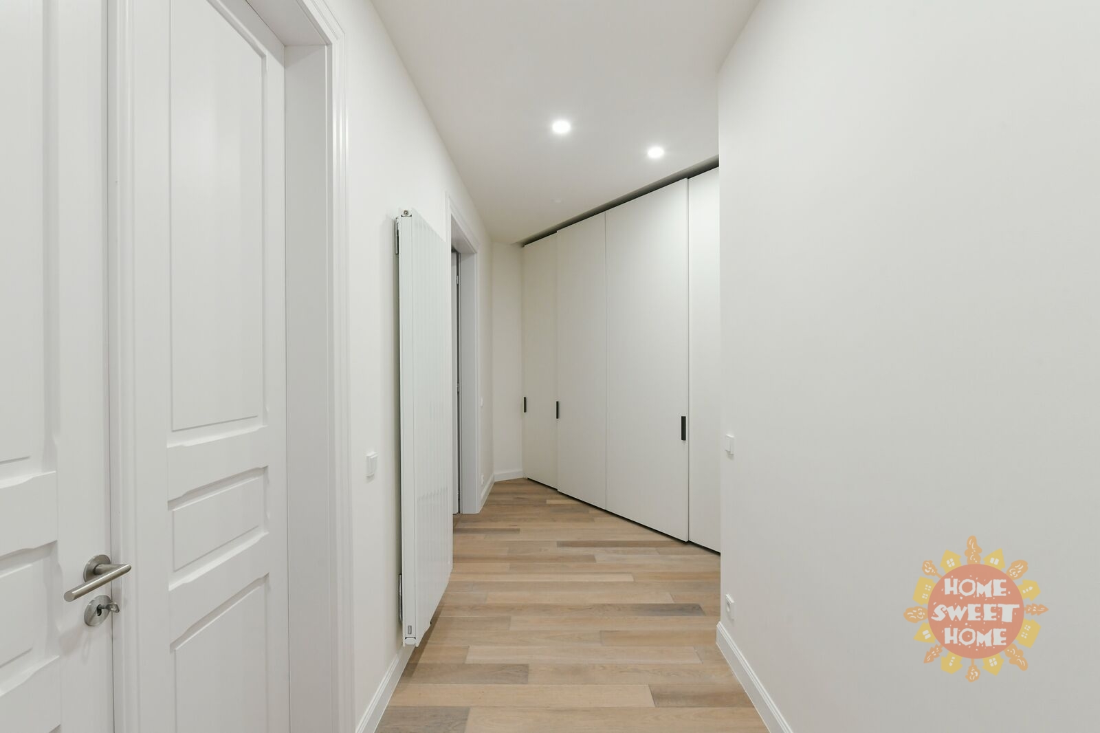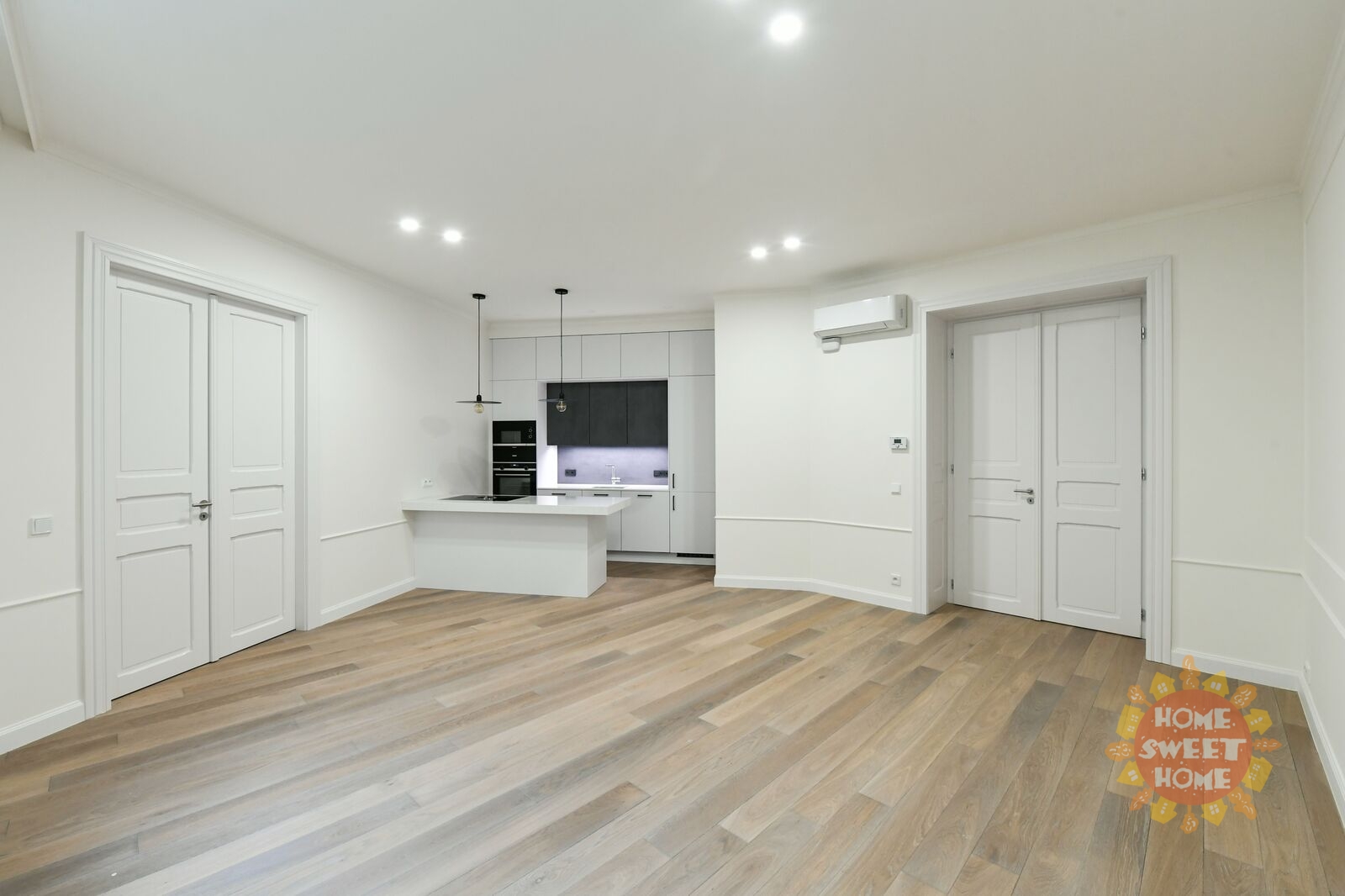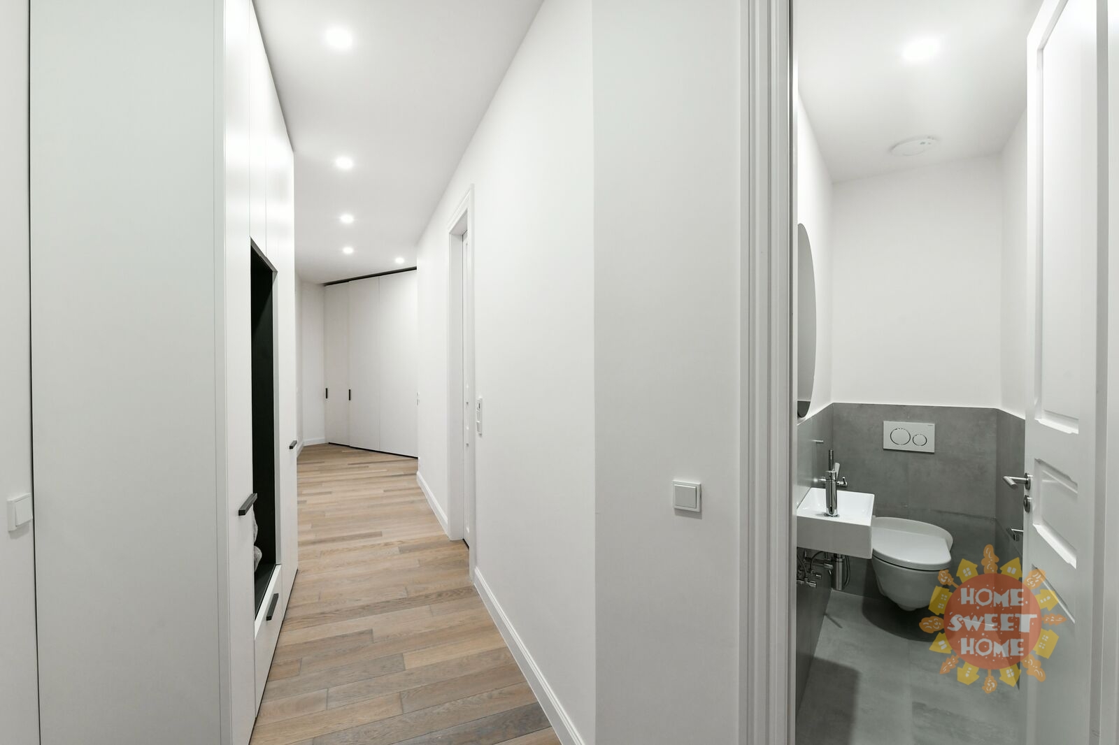 entrance hall with built-in wardrobes, living room with kitchen and dining area, 3 separate bedrooms (master bedroom with private bathroom), another bathroom with shower, utility room, pantry, separate toilet. The kitchenette is fully equipped with modern appliances. Plenty of storage space - built-in wardrobes in each room. The apartment uses quality materials, oak parquet floors, designer tiles, gas boiler, security doors. Washing machine and dryer available. One parking space 350m from the building must be rented with the apartment, price 6,500 + VAT