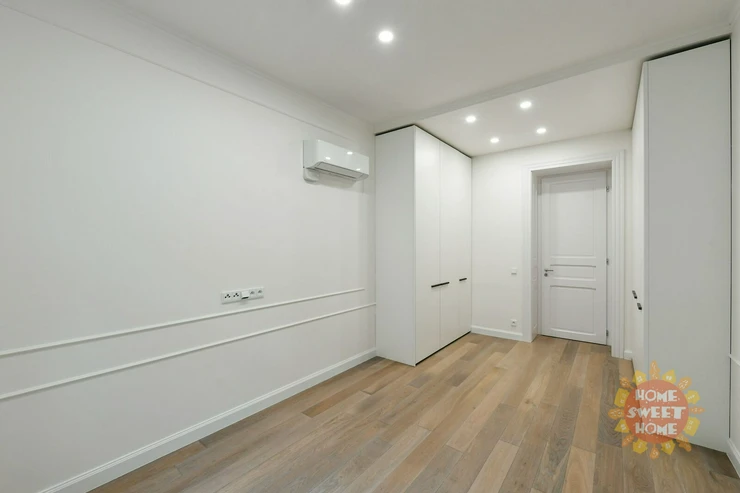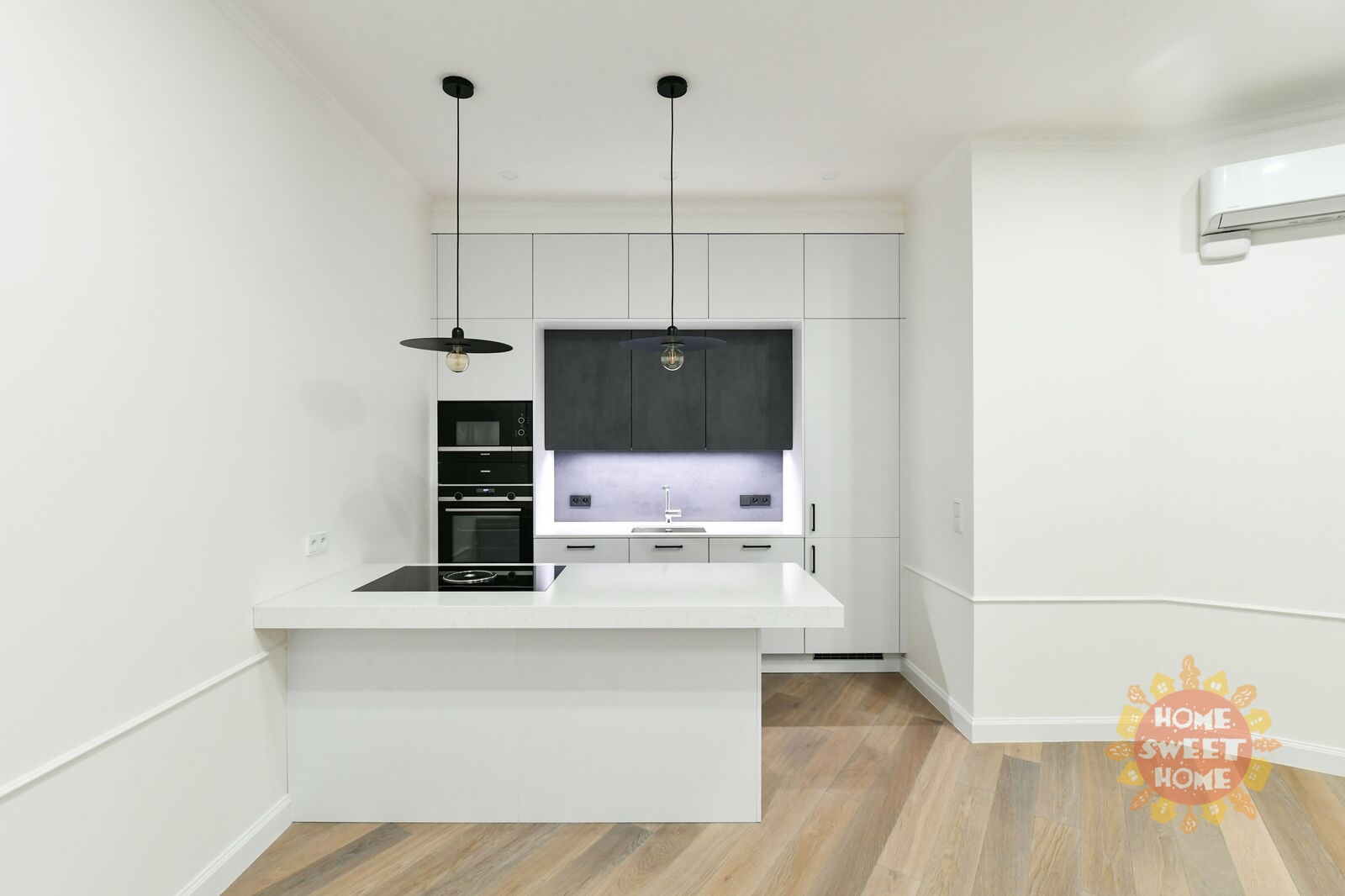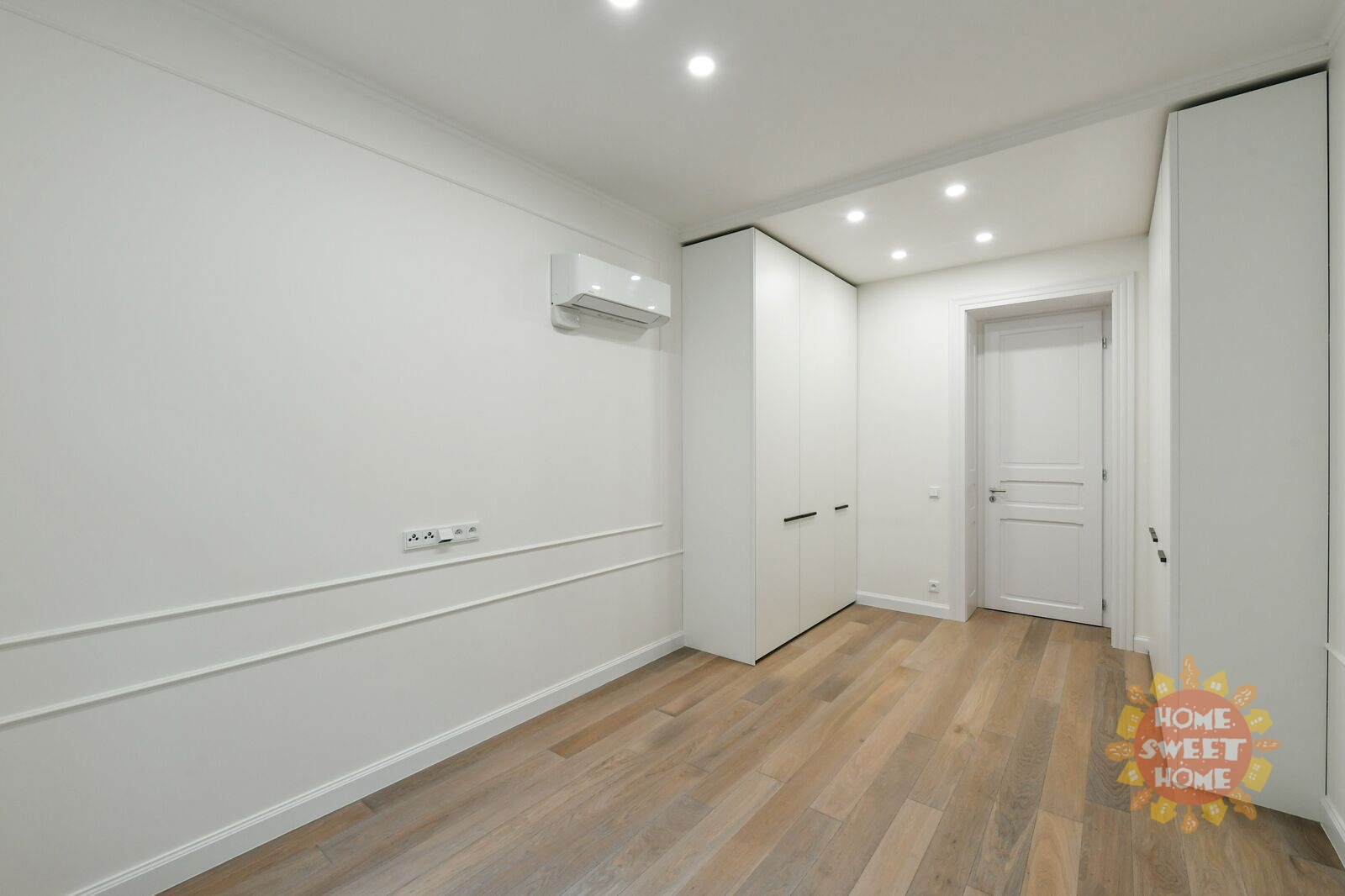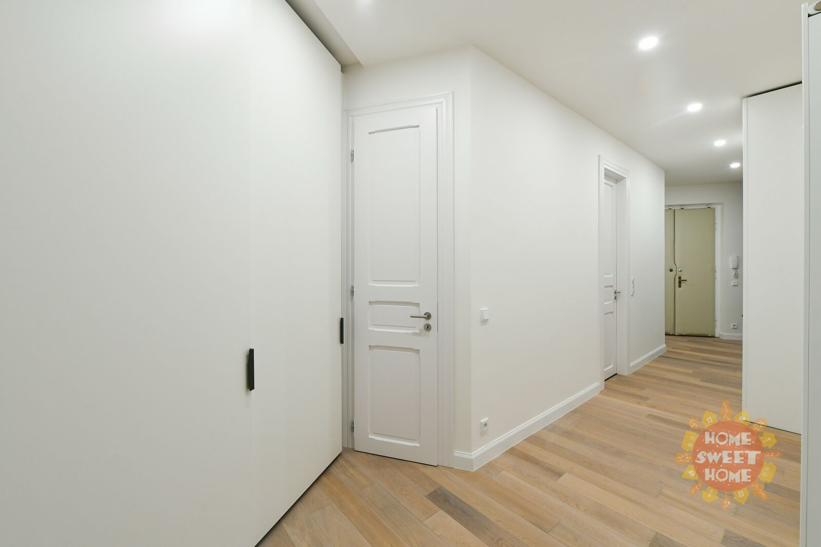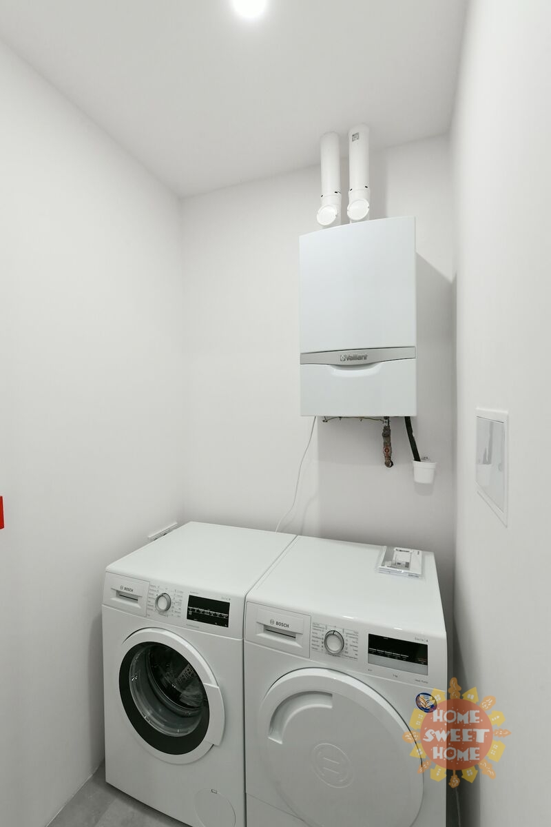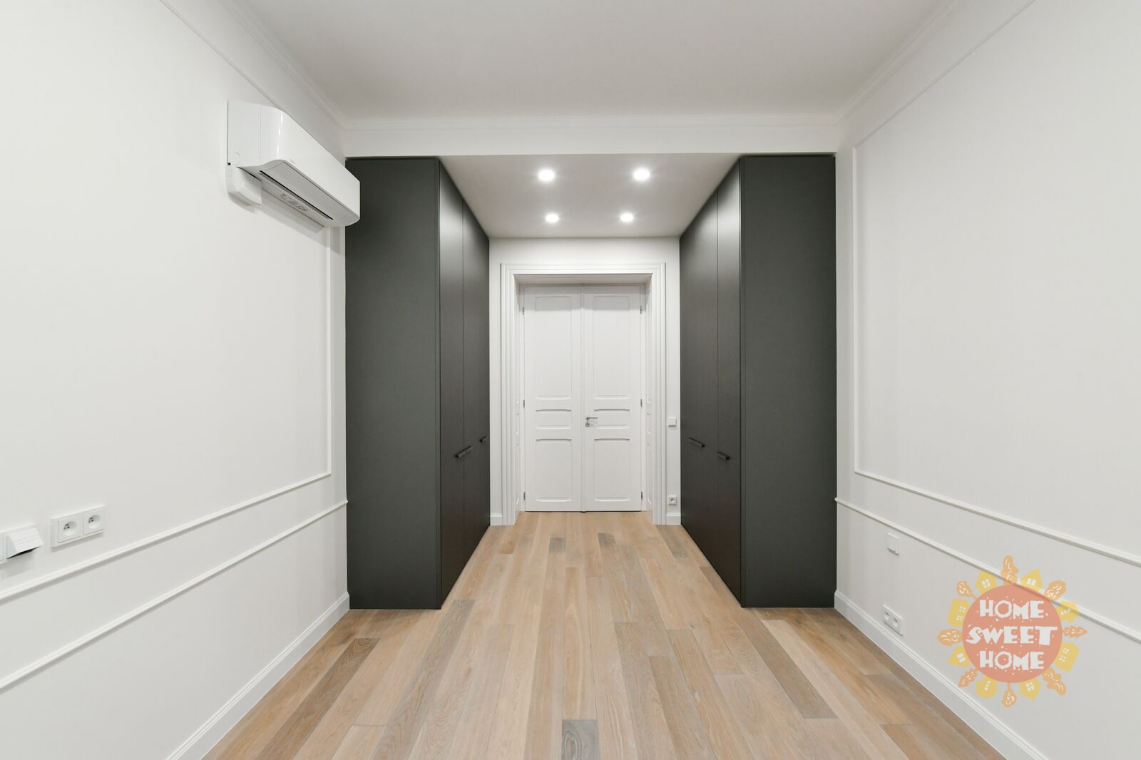 entrance hall with built-in wardrobes, living room with kitchen and dining area, 3 separate bedrooms (master bedroom with private bathroom), another bathroom with shower, utility room, pantry, separate toilet. The kitchenette is fully equipped with modern appliances. Plenty of storage space - built-in wardrobes in each room. The apartment uses quality materials, oak parquet floors, designer tiles, gas boiler, security doors. Washing machine and dryer available. One parking space 350m from the building must be rented with the apartment, price 6,500 + VAT