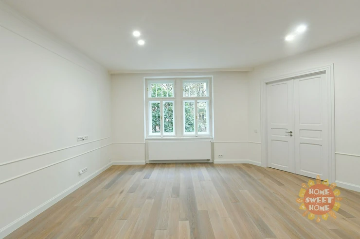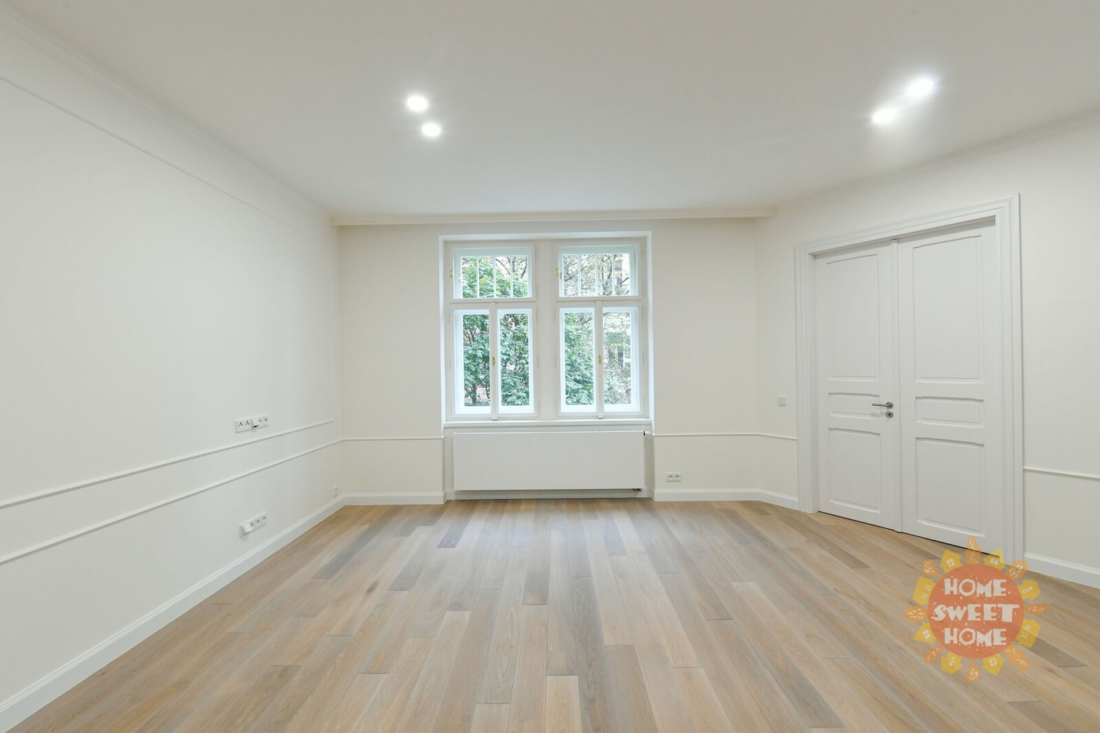 We offer for rent a renovated spacious apartment 4+kk (118 sqm + 2 sqm balcony). The above-standard unfurnished apartment is located on the second floor of a sensitively renovated Art Nouveau apartment building with an elevator in a popular location in Prague's Vinohrady, on Náměstí Jiřího z Poděbrad street.