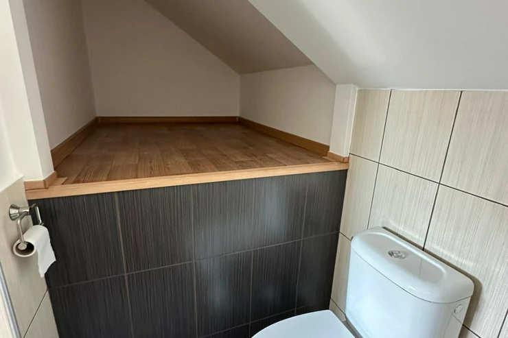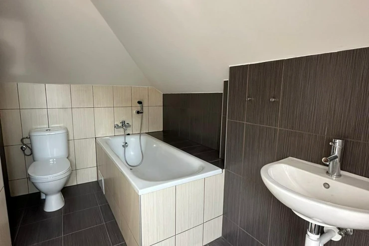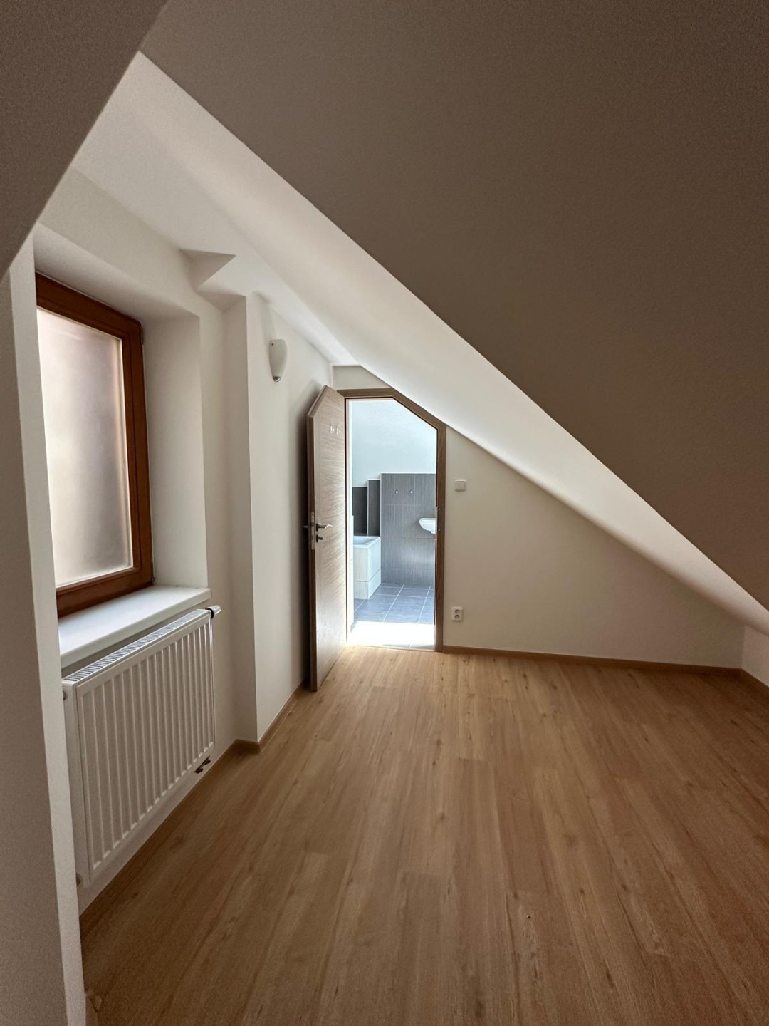 Upstairs, you'll find a cozy attic-style bedroom, a second bathroom with a bathtub and toilet, and an open space ideal for use as a walk-in closet or home office.