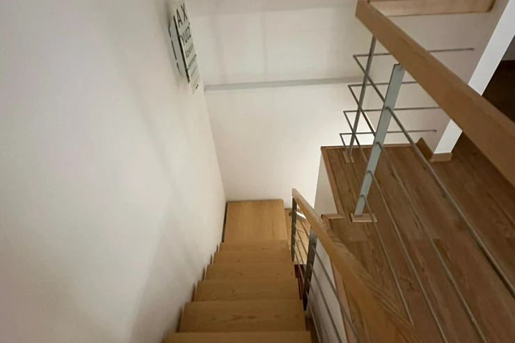 The lower level of the apartment features an entrance hall with a corridor leading to the first bathroom. There is also a spacious living room with a brand-new kitchen equipped with all appliances, including a dishwasher.