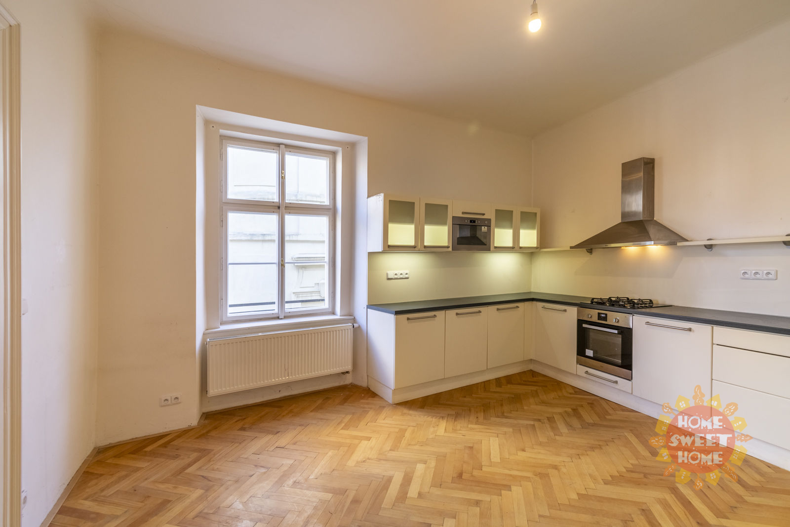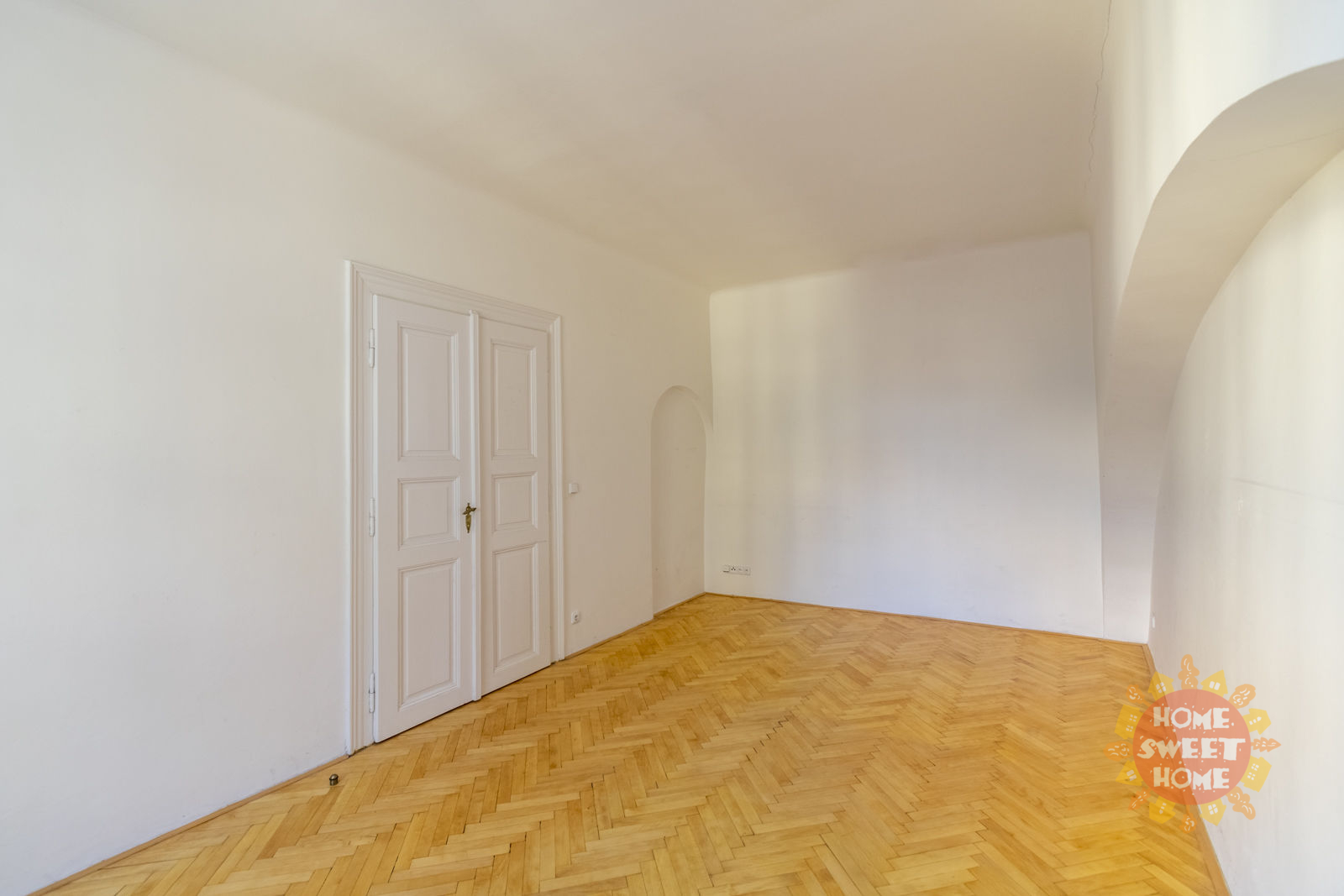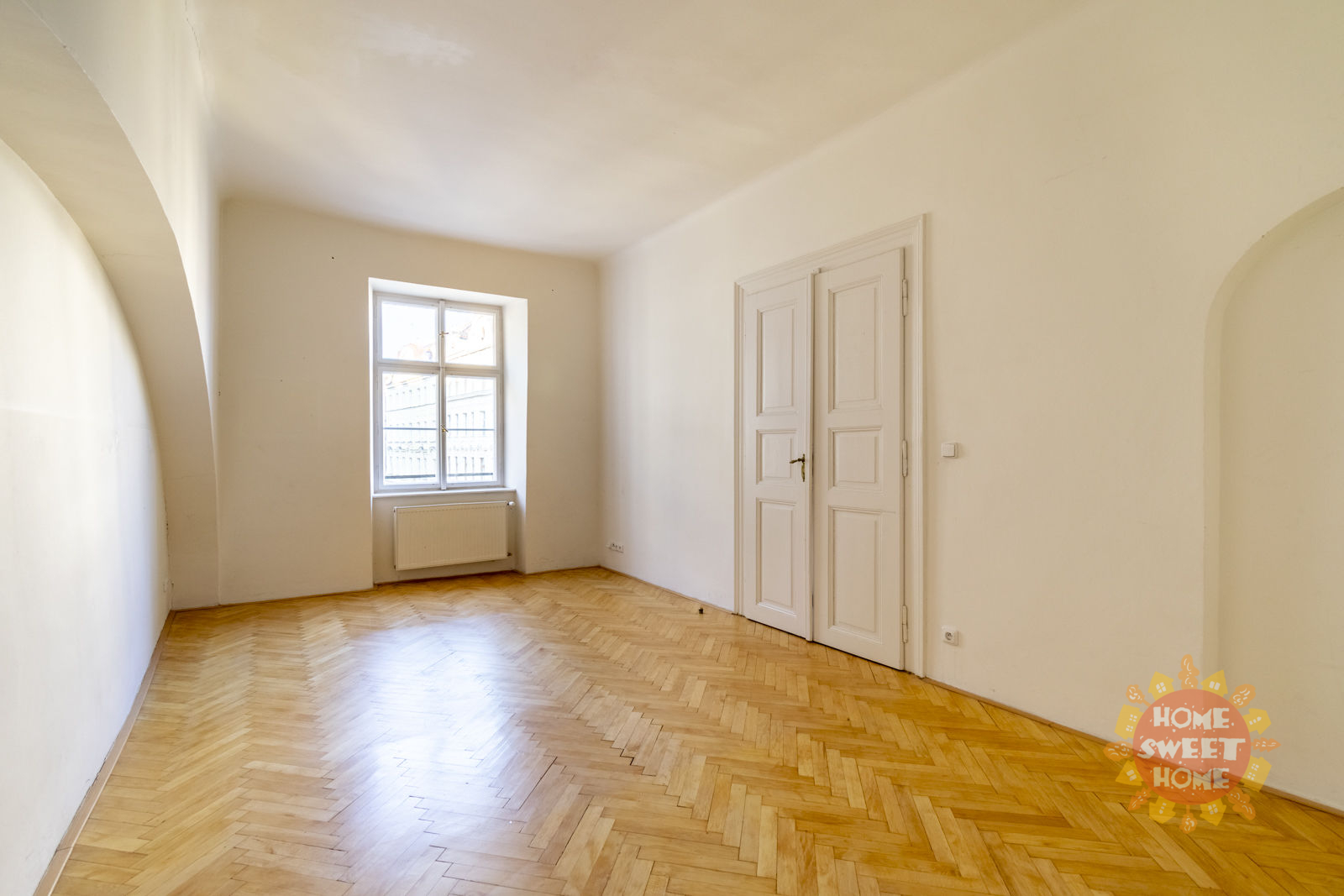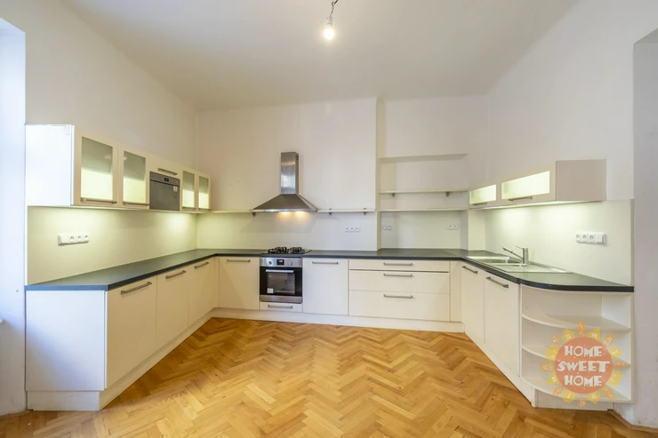 The layout of the apartment offers a living room with a pleasant view, a spacious kitchen equipped with an oven and stove, a dishwasher, a microwave oven, three bedrooms, two bathrooms, two toilets, a pantry and an entrance hall. Heating and water heating is provided by its own gas boiler. The apartment has interesting baroque vaults. Wooden parquet and tiles on the floors.