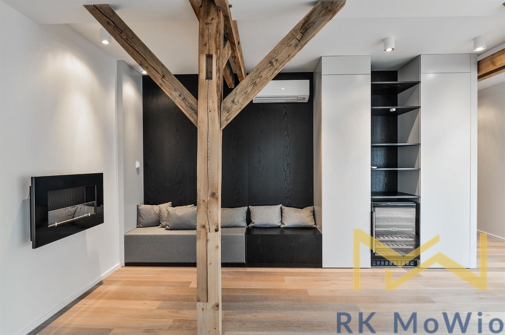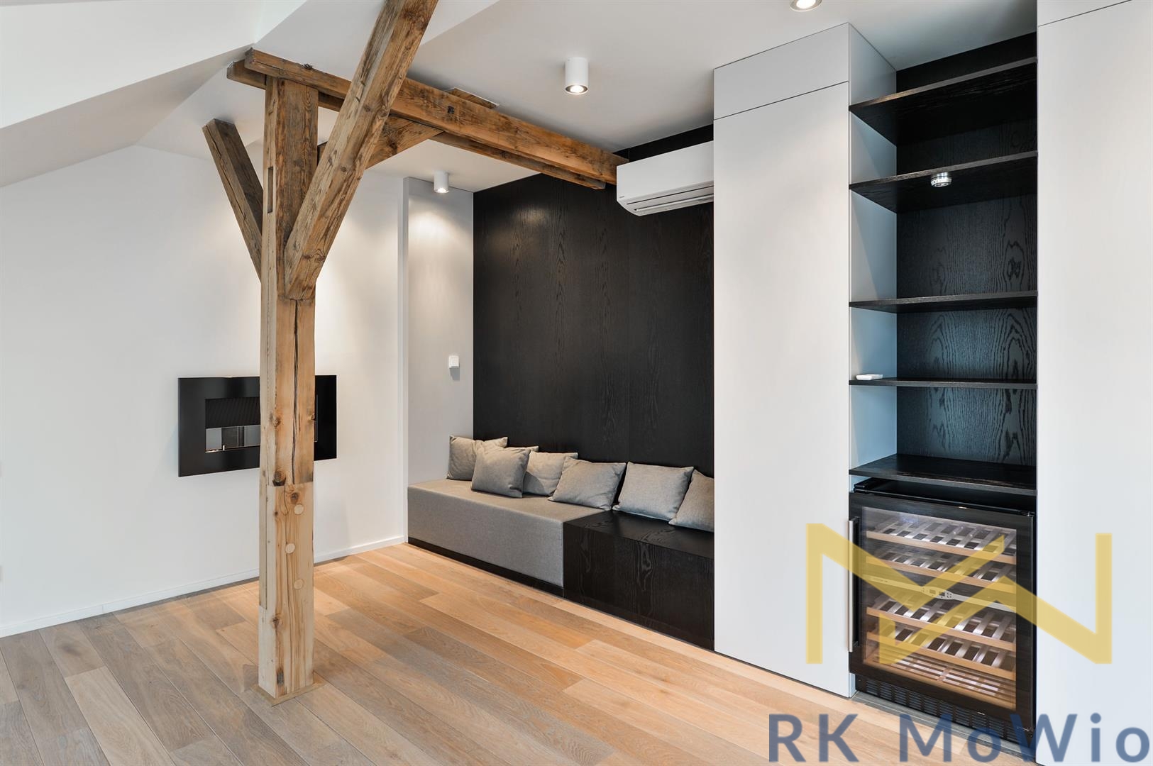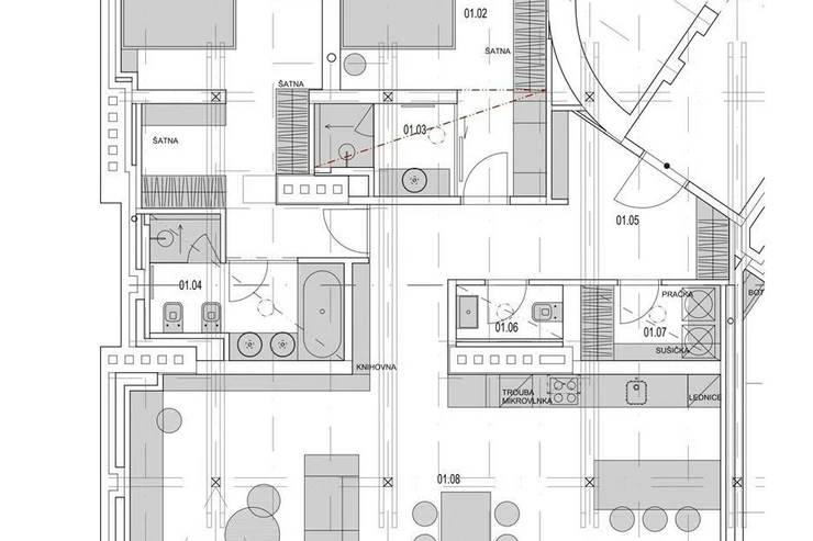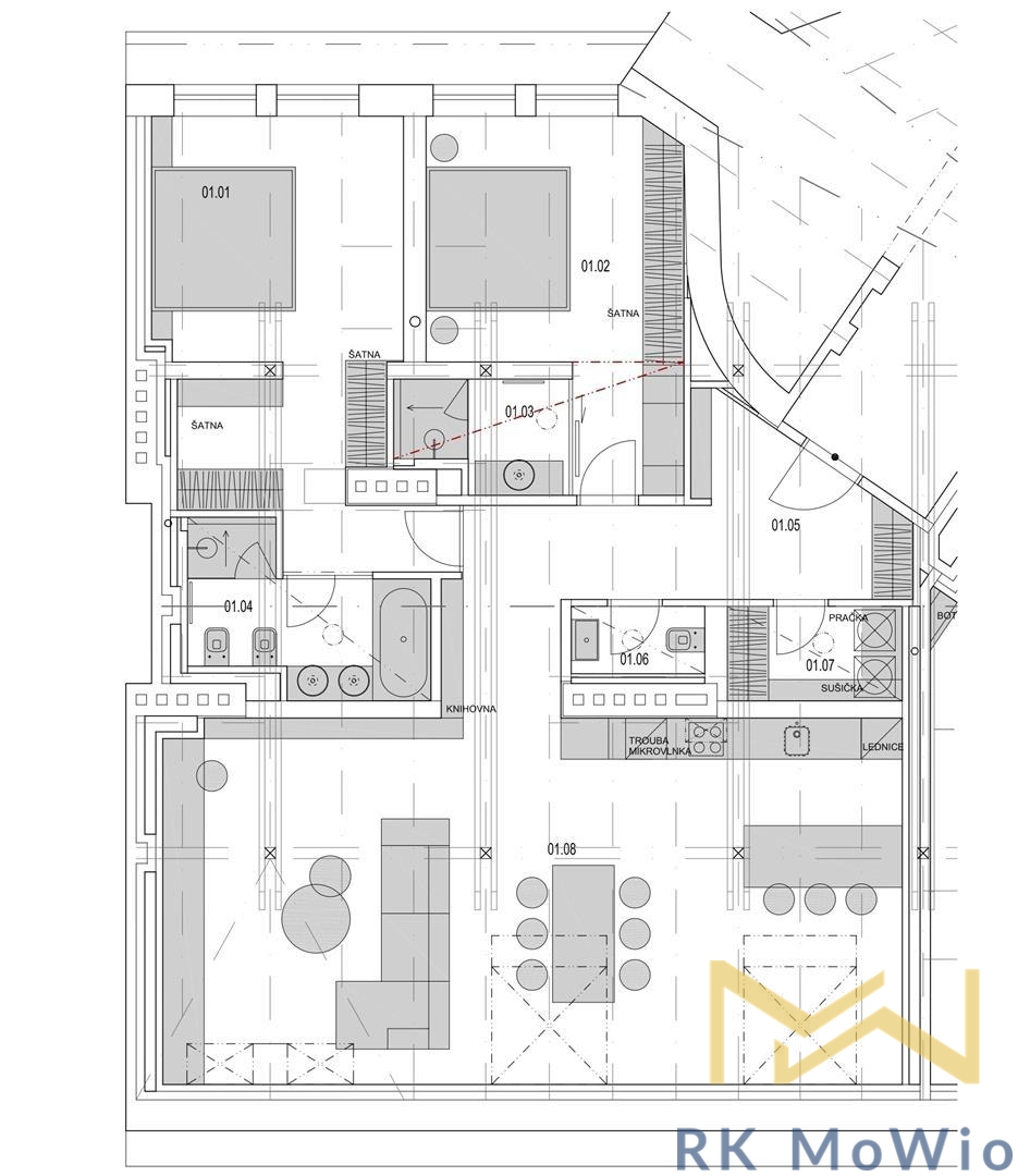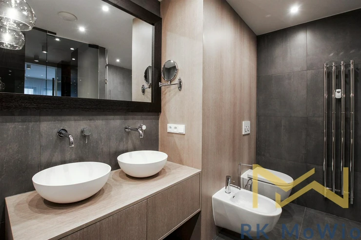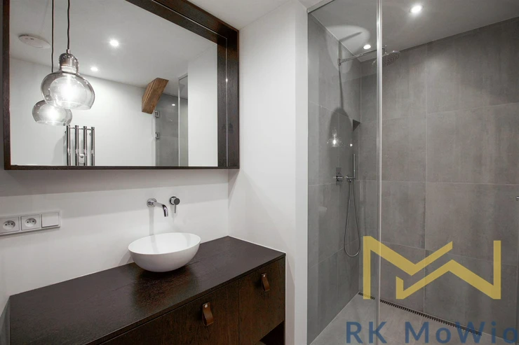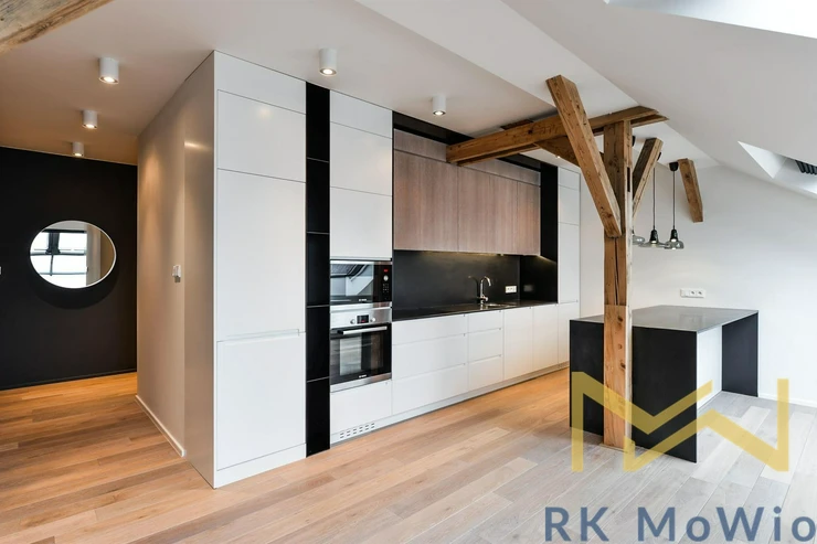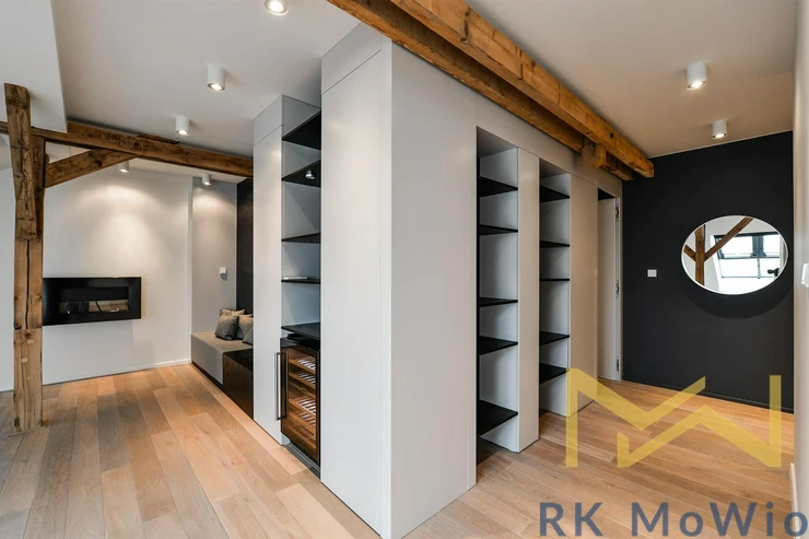 The layout of the apartment offers an entrance hall, a bright living room with skylights and exposed wooden beams, a kitchenette with an island and dining area, a master bedroom with a walk-through wardrobe and en-suite bathroom (bathtub, shower, double washbasin, bidet, toilet), a second bedroom with a private bathroom (shower, washbasin), a guest toilet, and a storage/laundry room. Additional features include a fully equipped kitchen (fridge with freezer, ceramic hob, built-in electric and microwave oven), built-in wardrobes, washer and dryer, air conditioning, wine fridge, wooden oak floors, tiles, and new double-glazed windows. It is mandatory to rent 1 parking space for an additional fee of CZK 6,500/month + 21% VAT = CZK 7,865/month. Furnishing can be arranged for a higher rent.