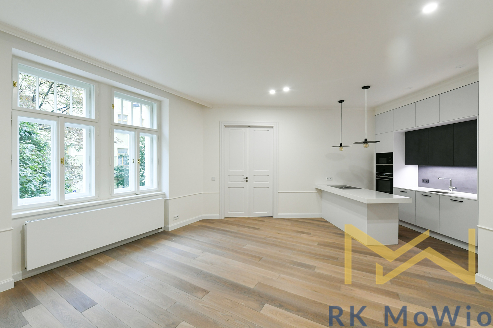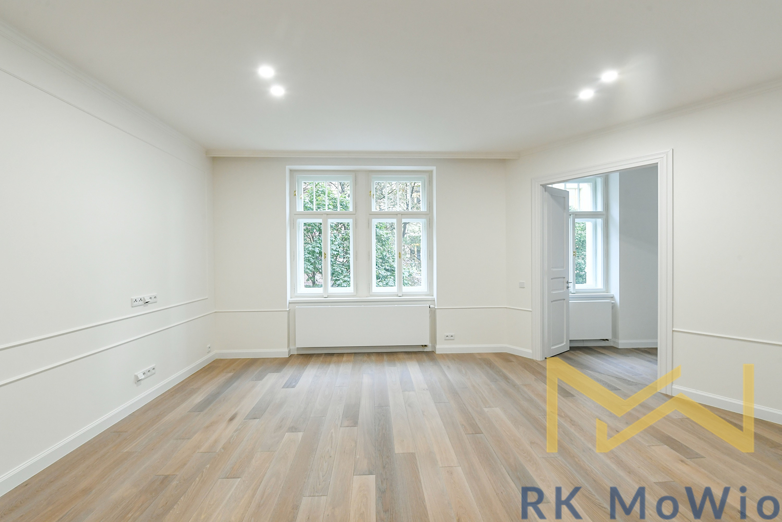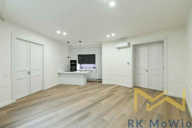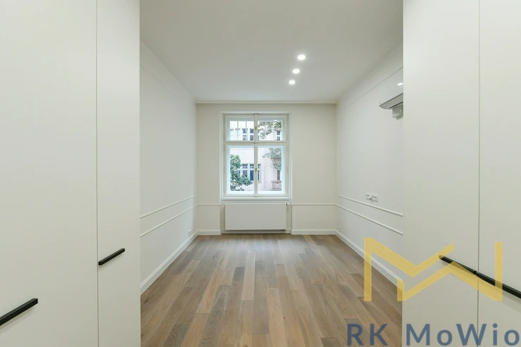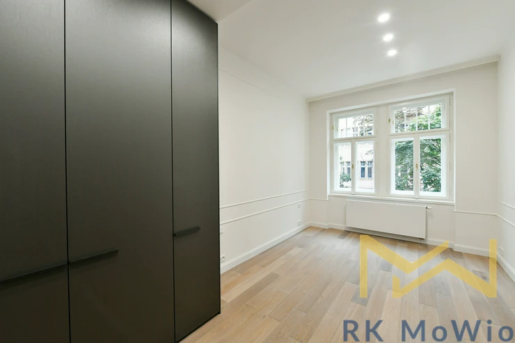The layout includes an entrance hall, an airy living room with a kitchen unit, two bedrooms, and a study. From the hallway, there is access to the bathroom, a separate toilet, and a storage room. The entire apartment features solid oak wooden floors, adding an elegant and cozy atmosphere. The apartment is fitted with beautiful new double-glazed windows. The bathroom and toilet are finished with elegant grey marble. It is mandatory to rent one parking space for an additional fee of CZK 7,865/month including VAT.