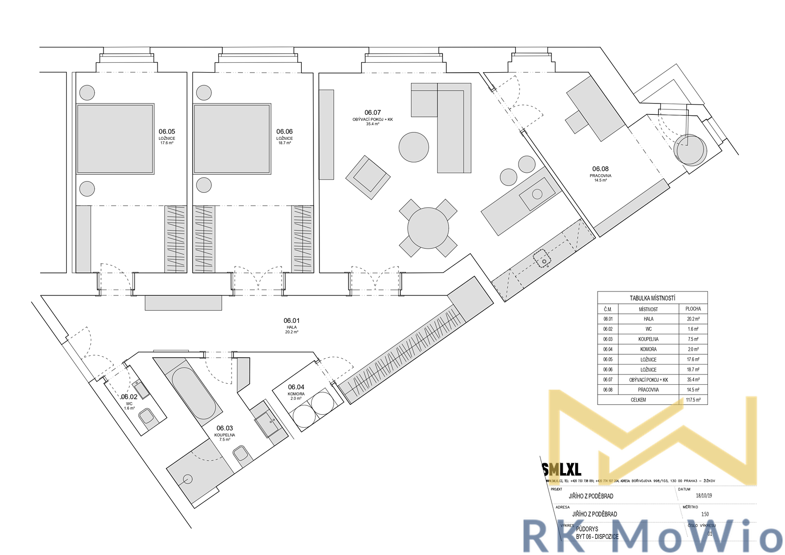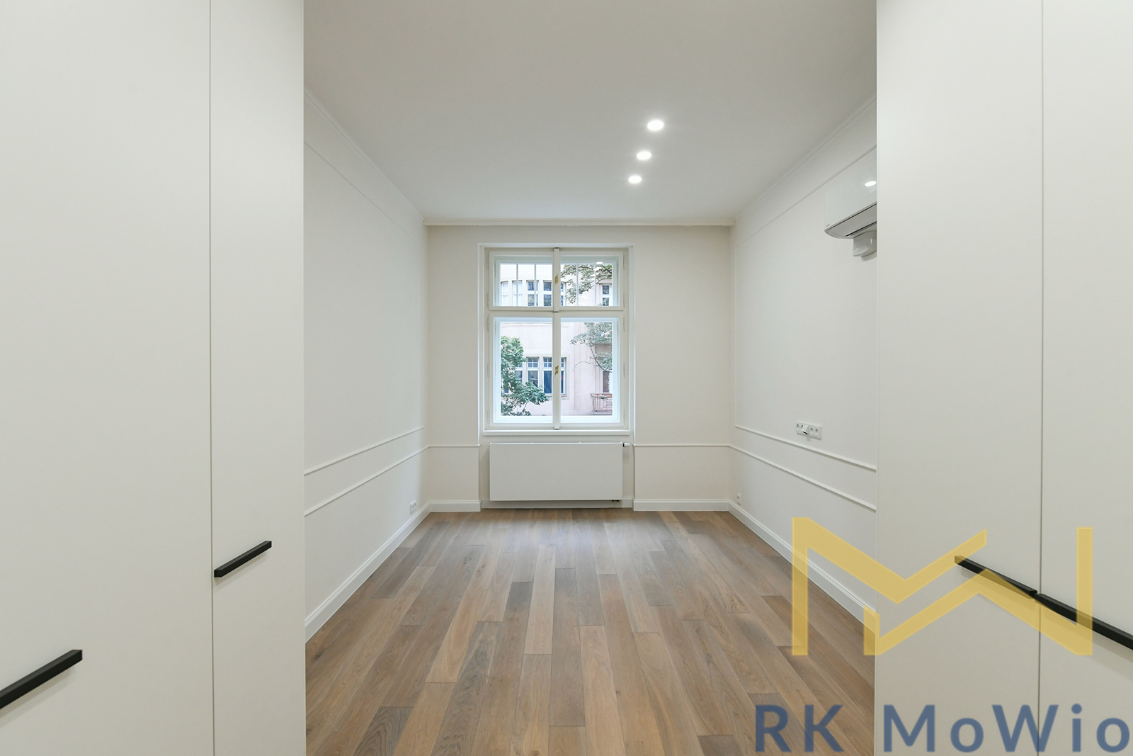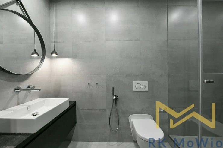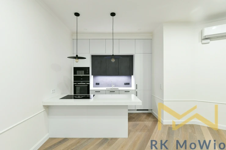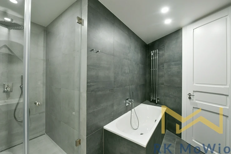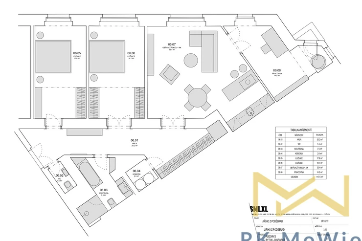 The layout includes an entrance hall, an airy living room with a kitchen unit, two bedrooms, and a study. From the hallway, there is access to the bathroom, a separate toilet, and a storage room. The entire apartment features solid oak wooden floors, adding an elegant and cozy atmosphere. The apartment is fitted with beautiful new double-glazed windows. The bathroom and toilet are finished with elegant grey marble. It is mandatory to rent one parking space for an additional fee of CZK 7,865/month including VAT.