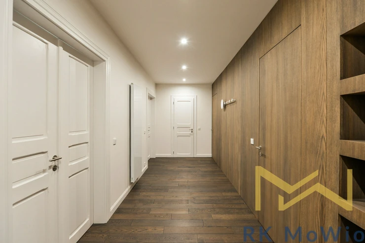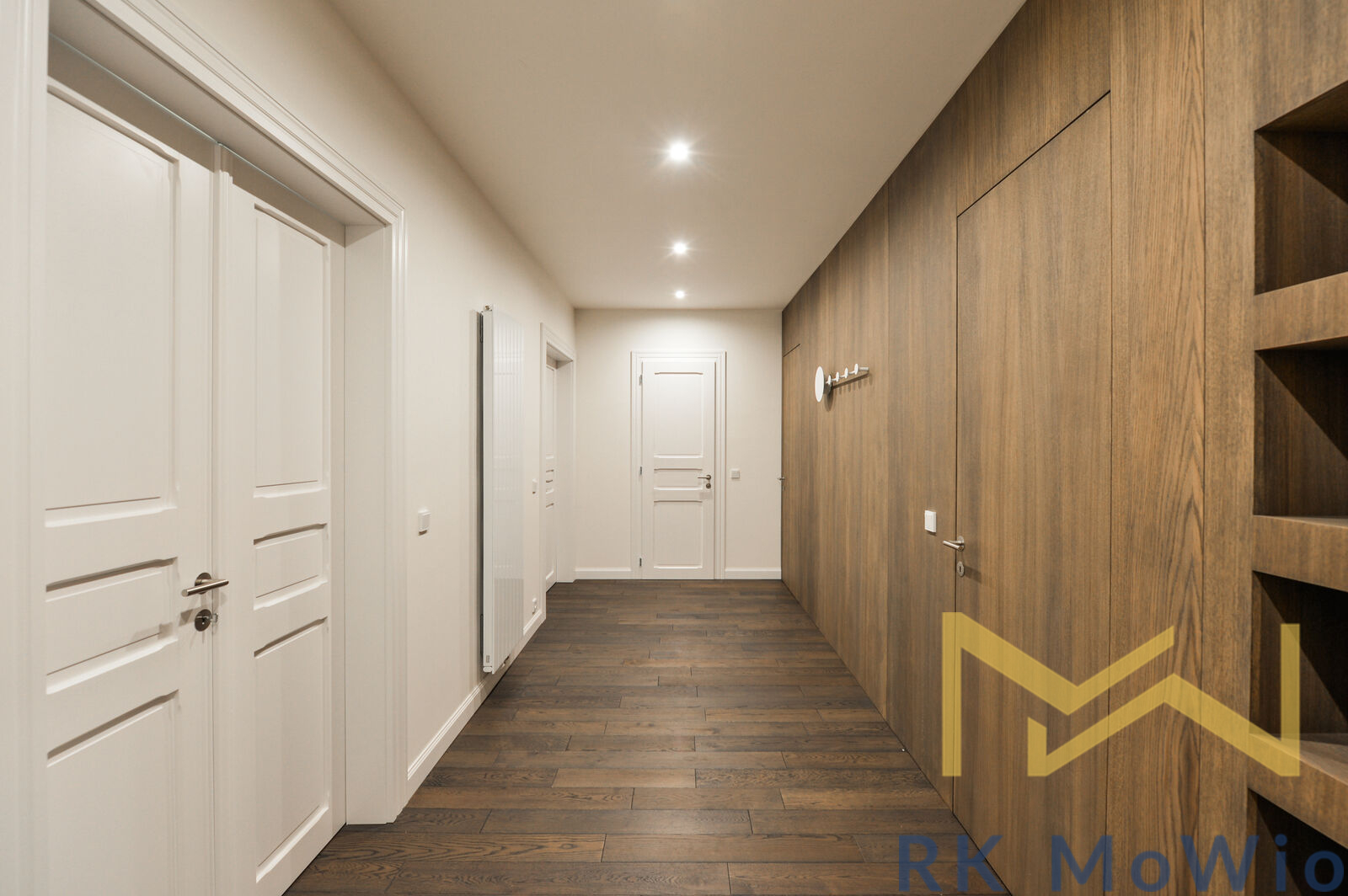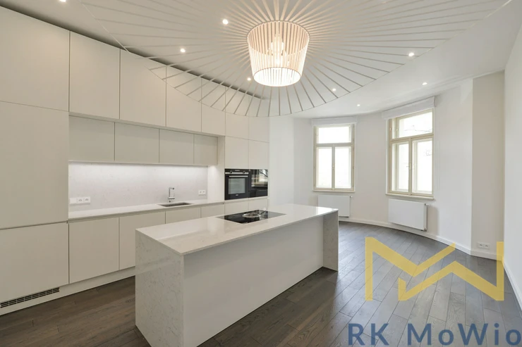 The apartment features an entrance hall, a spacious living room with a kitchenette with an island and dining area, a master bedroom with a walk-in closet and en-suite bathroom (bathtub, washbasin, toilet), two additional bedrooms, a separate bathroom (shower, washbasin, bidet, toilet), and a utility room. Additional features include a fully equipped kitchen (fridge with freezer, ceramic hob, built-in electric and microwave ovens), washer-dryer, built-in wardrobes, wine fridge, preparation for high-speed internet, new double-glazed windows, wooden oak floors, tiles, and air conditioning. A cellar is included in the rent. It is mandatory to rent a parking space for an additional fee of CZK 7,865/month including VAT.