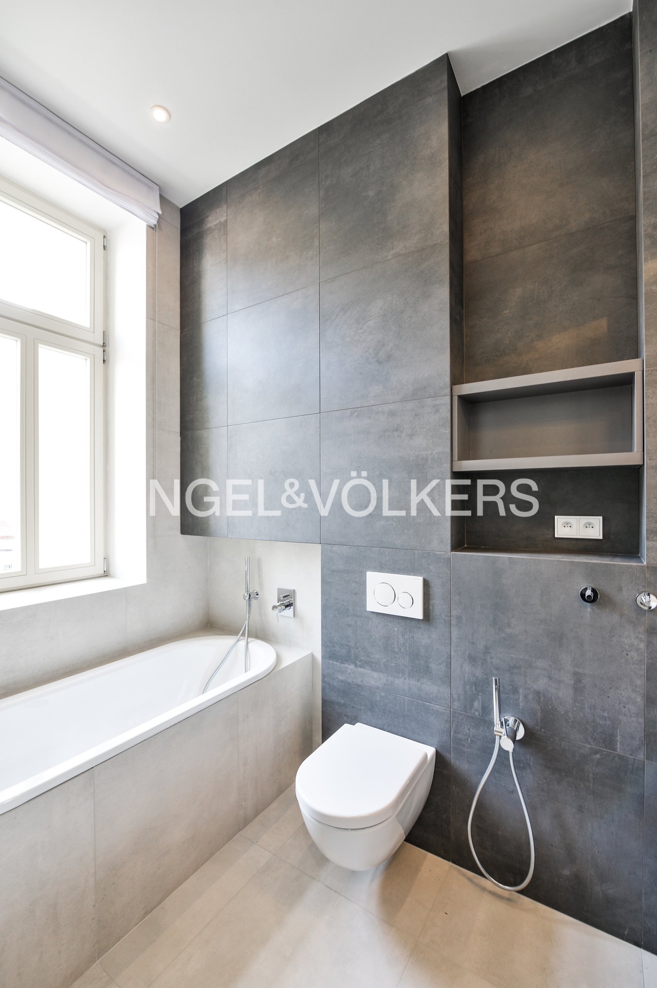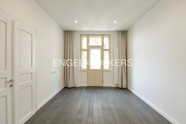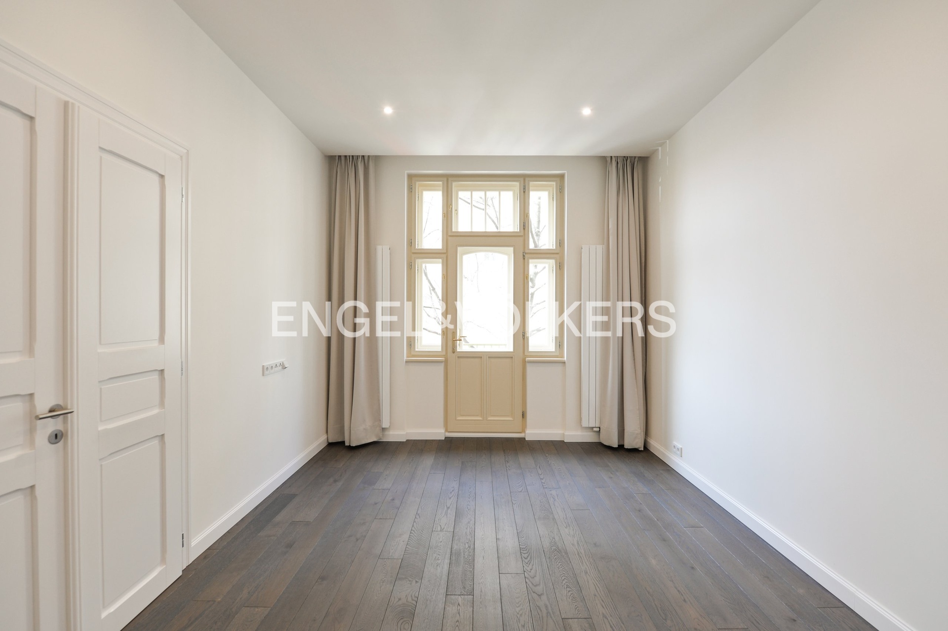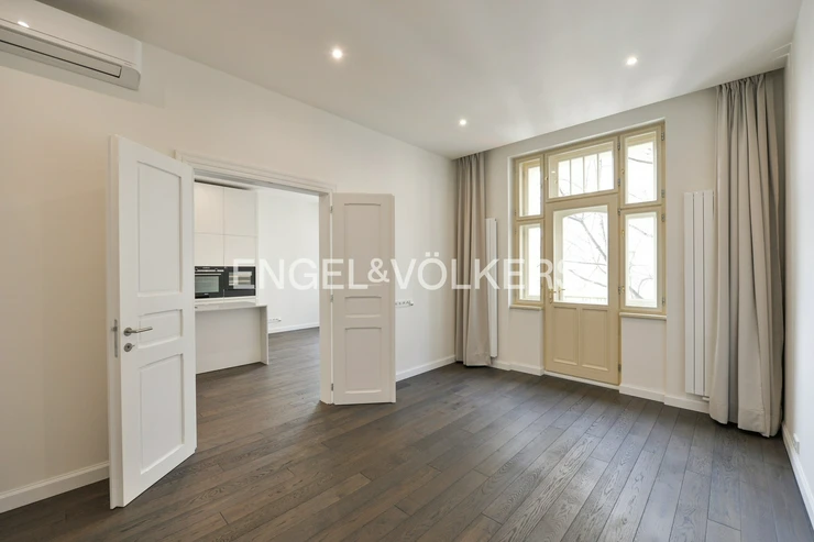 During the costly renovation, care was taken to preserve all original decorative and architectural elements of the house. Only quality materials and equipment, such as solid oak parquet, quality tiles and sanitary equipment, large windows for maximum light, security doors, and air conditioning, were used to renovate the apartment.