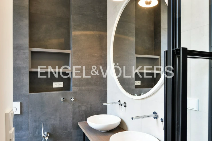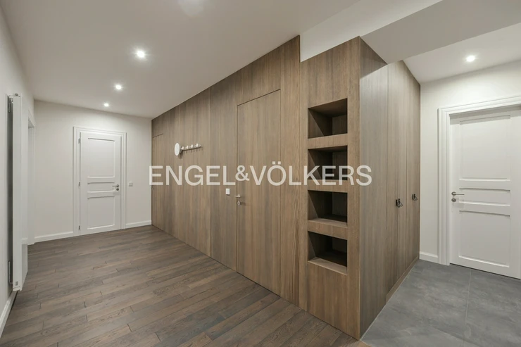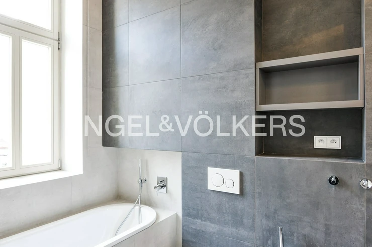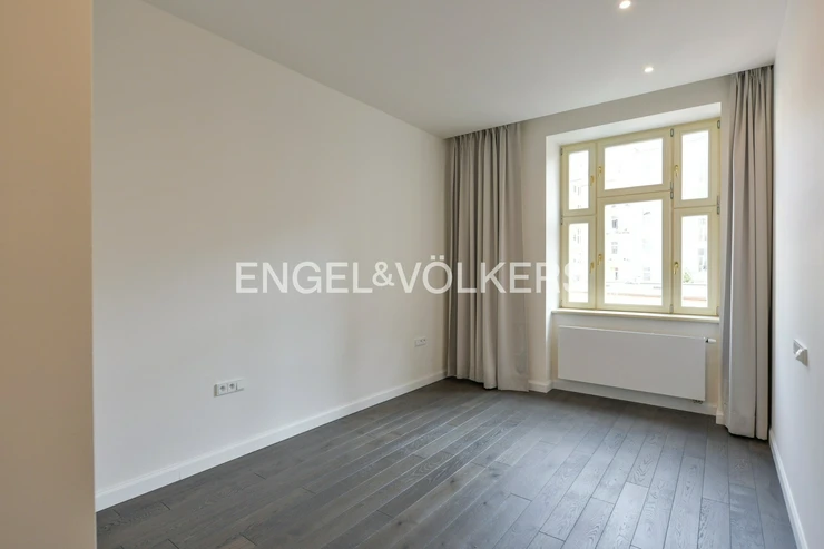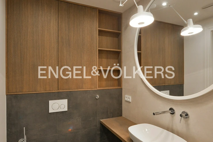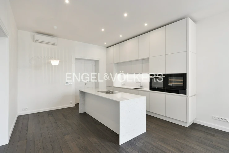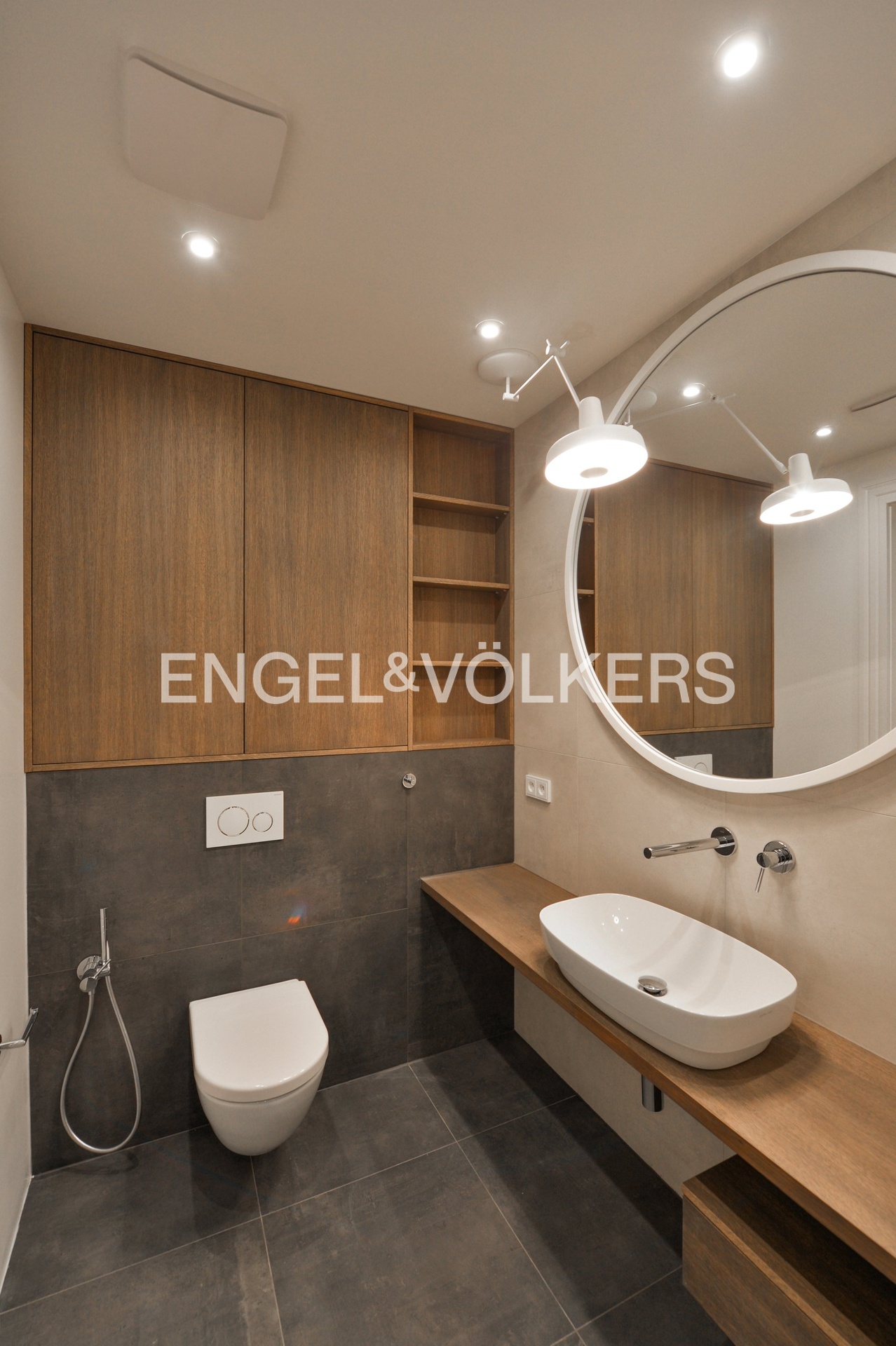 During the costly renovation, care was taken to preserve all original decorative and architectural elements of the house. Only quality materials and equipment, such as solid oak parquet, quality tiles and sanitary equipment, large windows for maximum light, security doors, and air conditioning, were used to renovate the apartment.