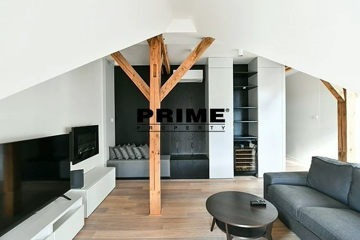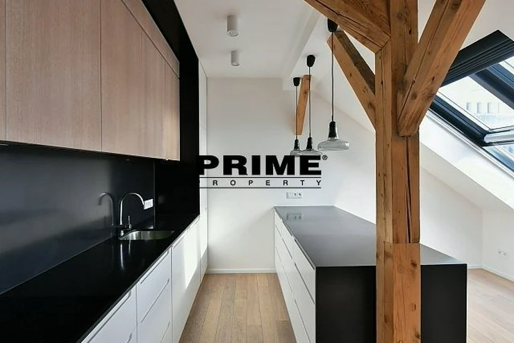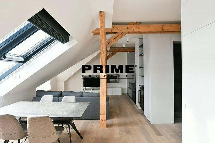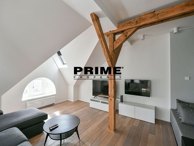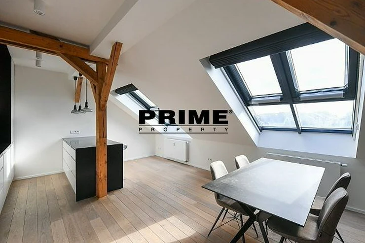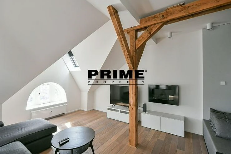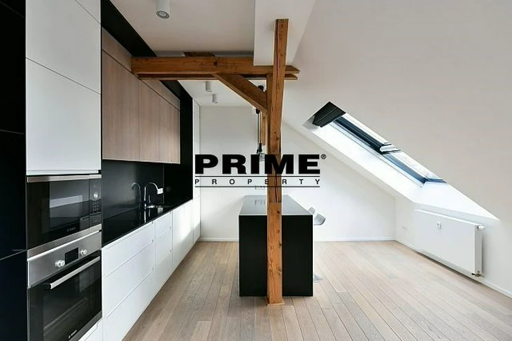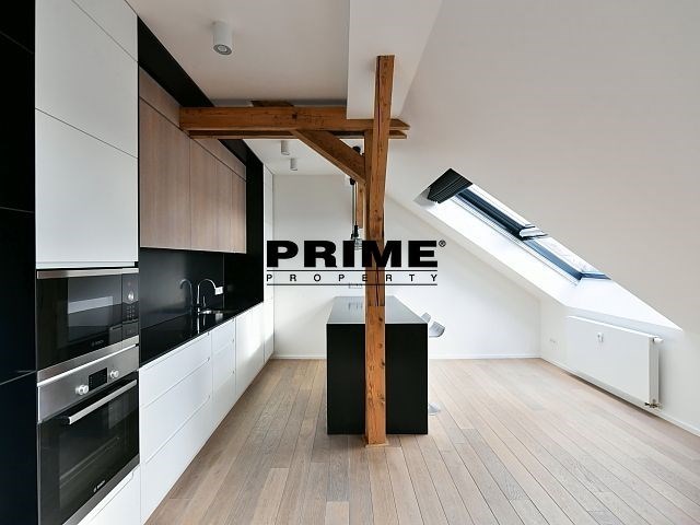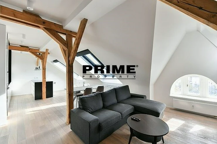 Newly renovated, exclusive, 2 bedroom, 2 bathroom, air conditioned, furnished attic apartment for rent, 3+kk, 156m2, with a garage parking space, situated on the 5th floor of a completely renovated Art Nouveau building with a lift.