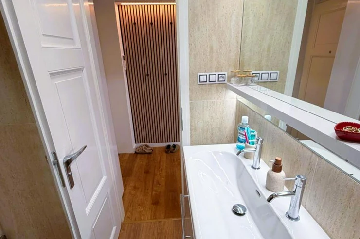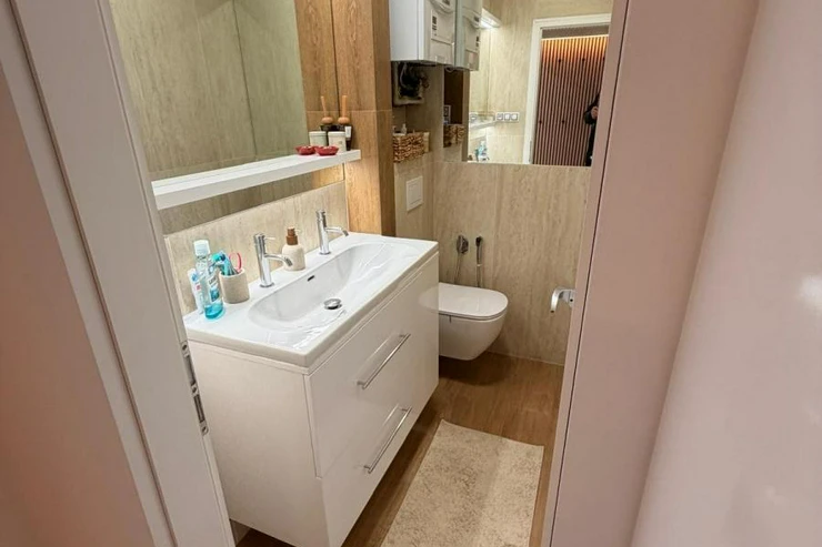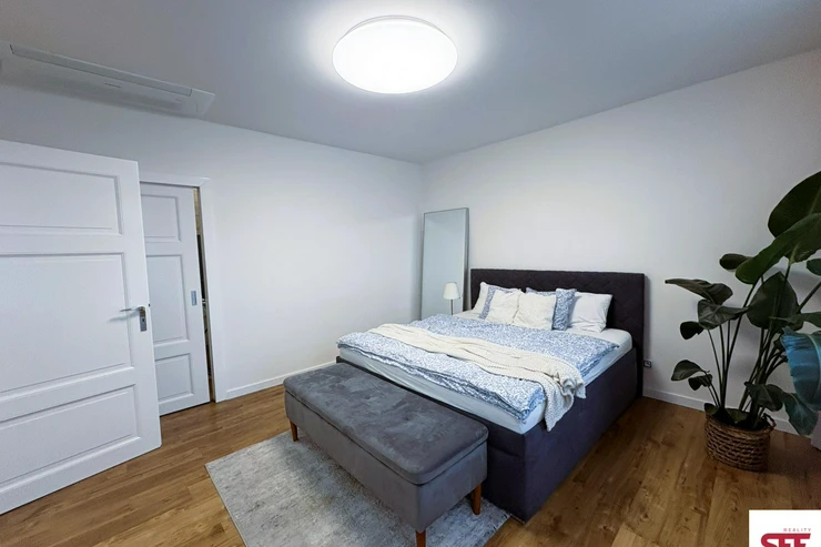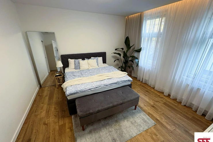 The apartment is fully furnished with quality furniture and appliances, including a washing machine, dryer, sofa, dining table with chairs, large bed with mattress, wardrobes, lighting, decorations, and more. Wooden parquet floors add to the overall atmosphere, and the apartment has its own boiler for independent heating.